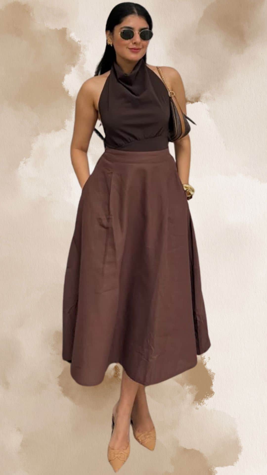 This stunning outfit features a deep chocolate brown halter neck top and a matching full-length skirt that create a sophisticated silhouette, perfect for any occasion.