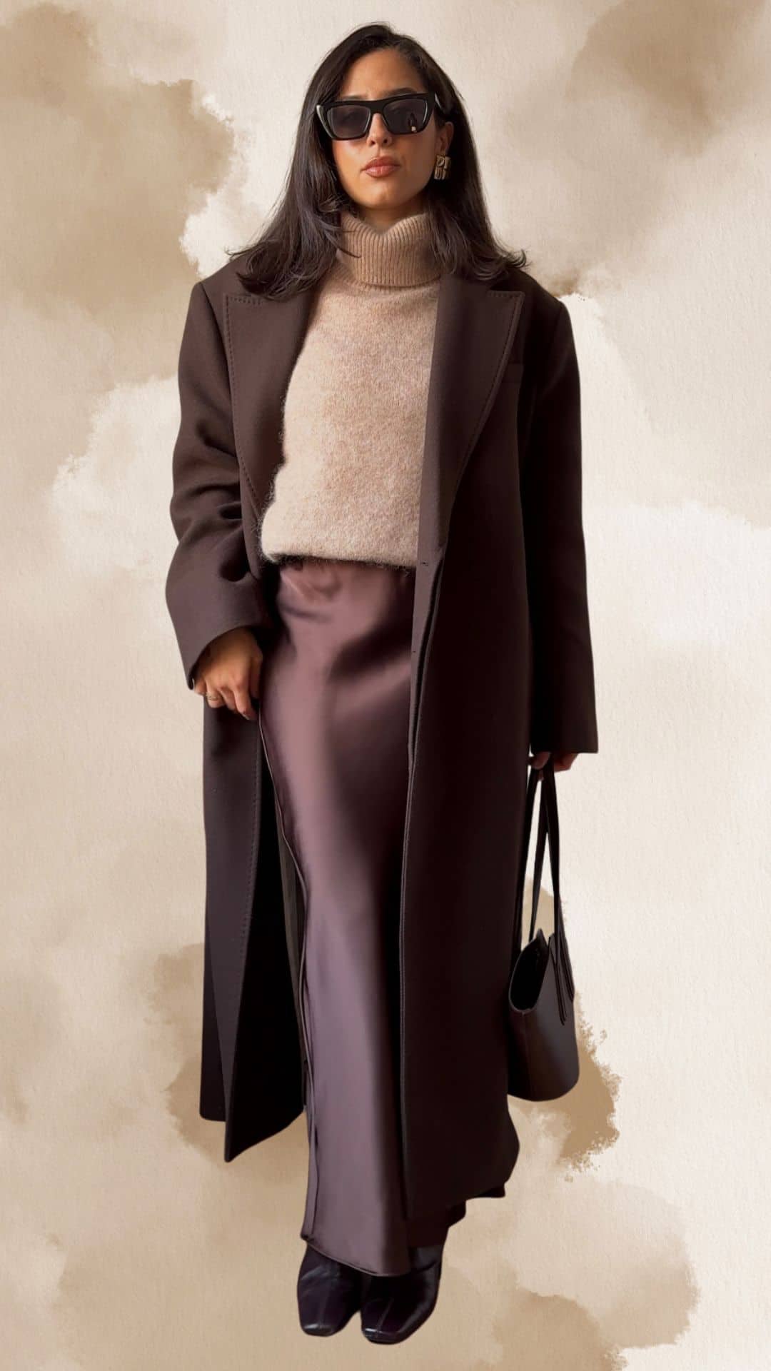 The combination of a cozy beige turtleneck with a dark brown long coat creates a sophisticated layer, while the satin brown skirt adds a touch of elegance.