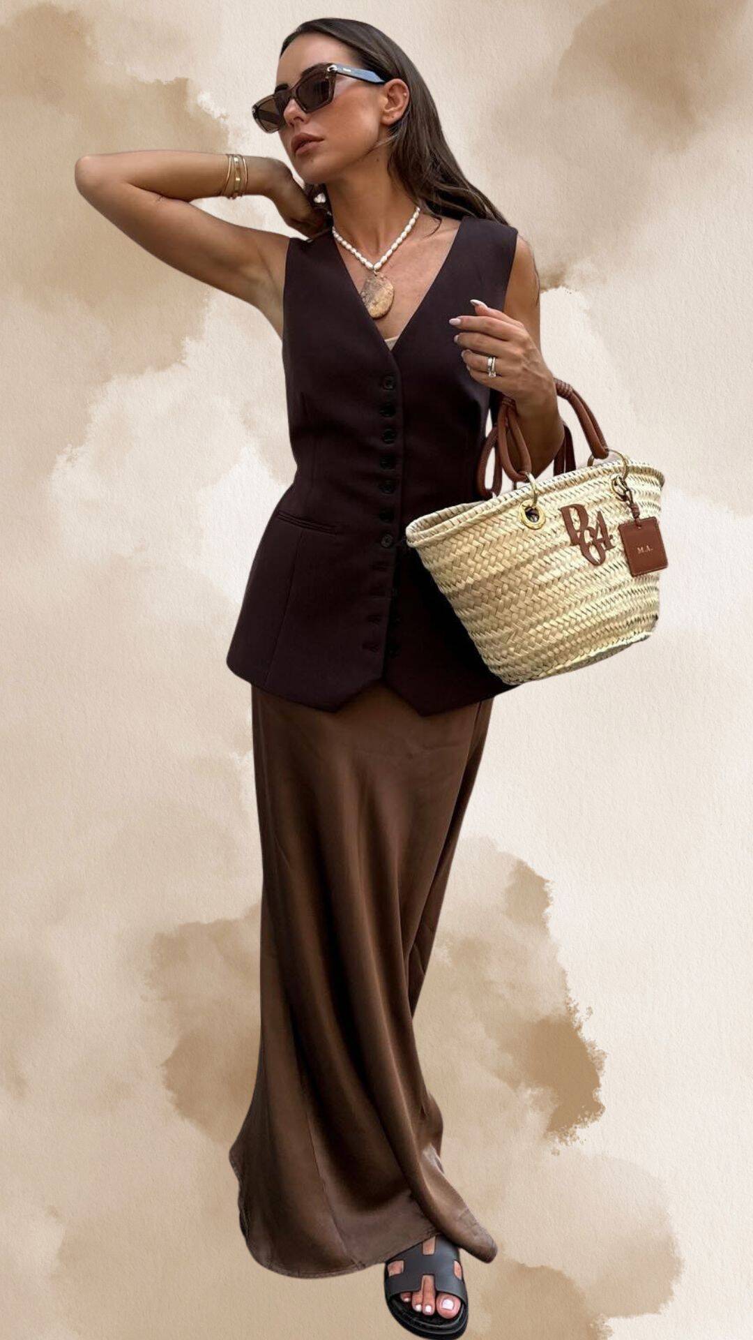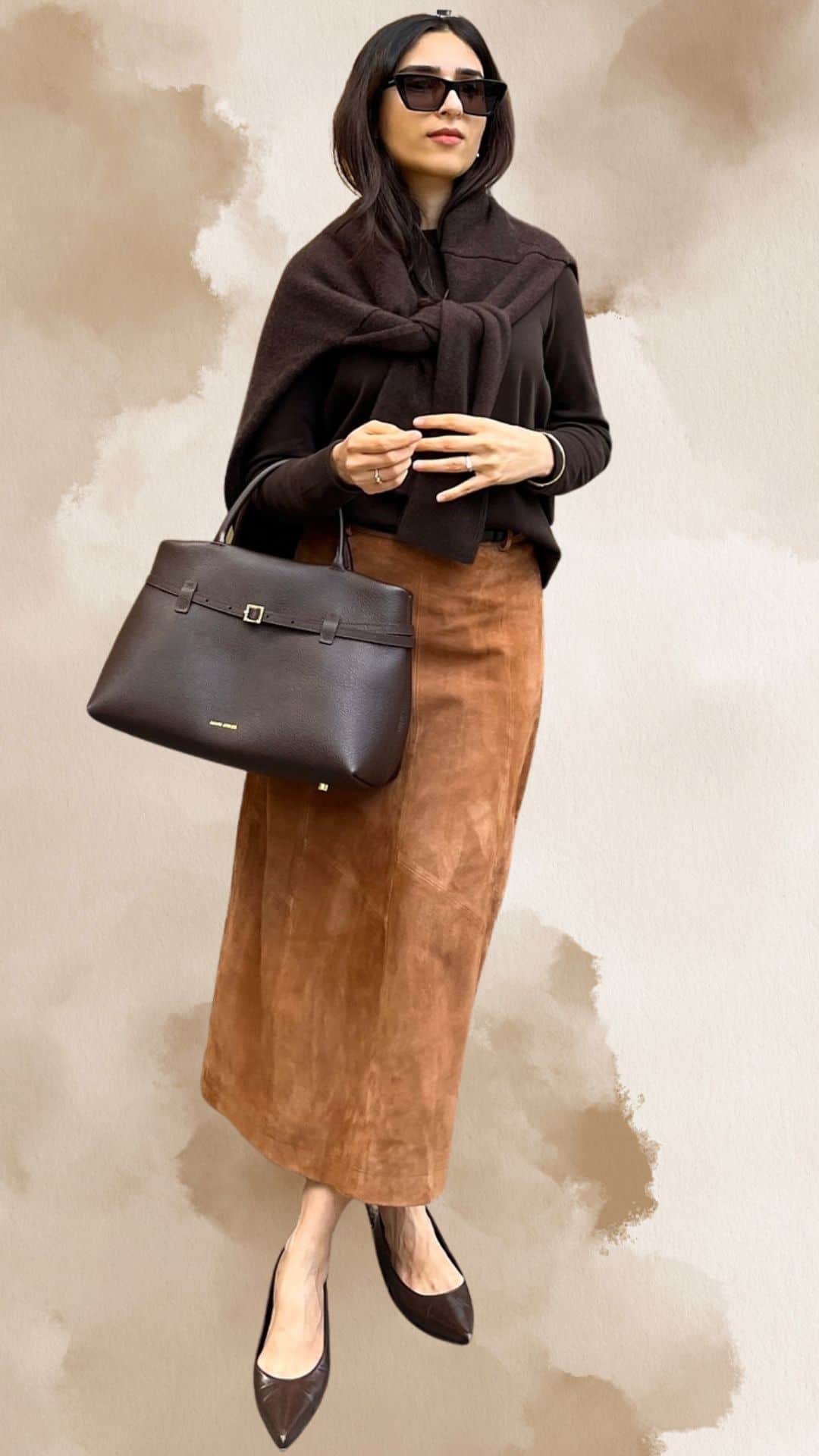 The fitted brown skirt gracefully flows to the ankles, while coordinating brown slide sandals and a large suede handbag enhance the overall chic aesthetic.