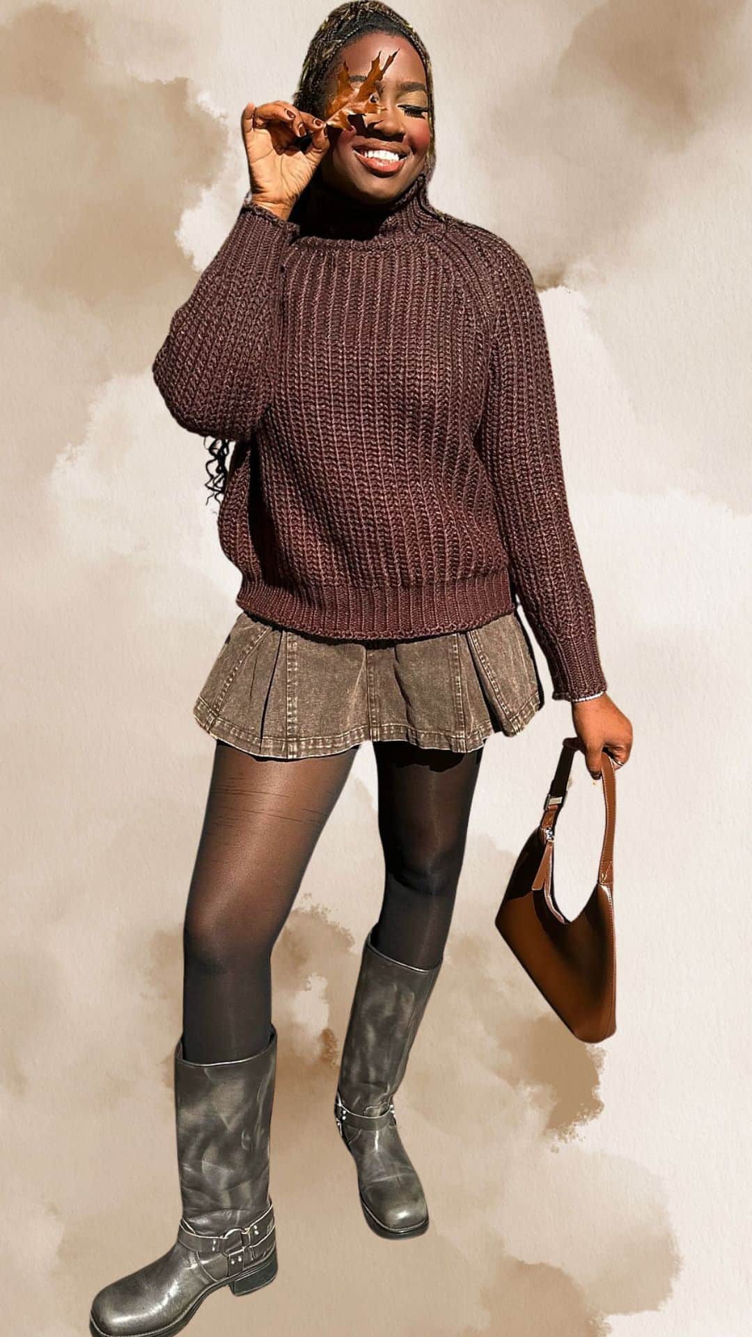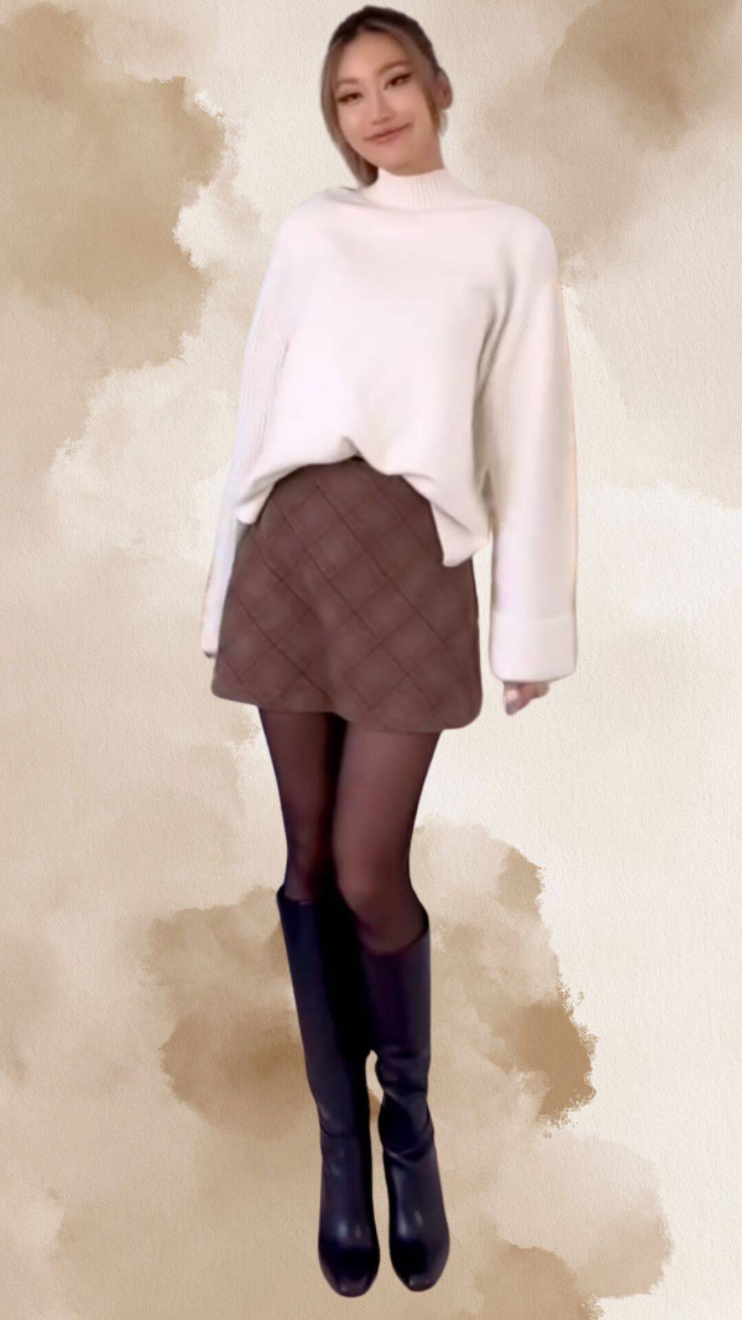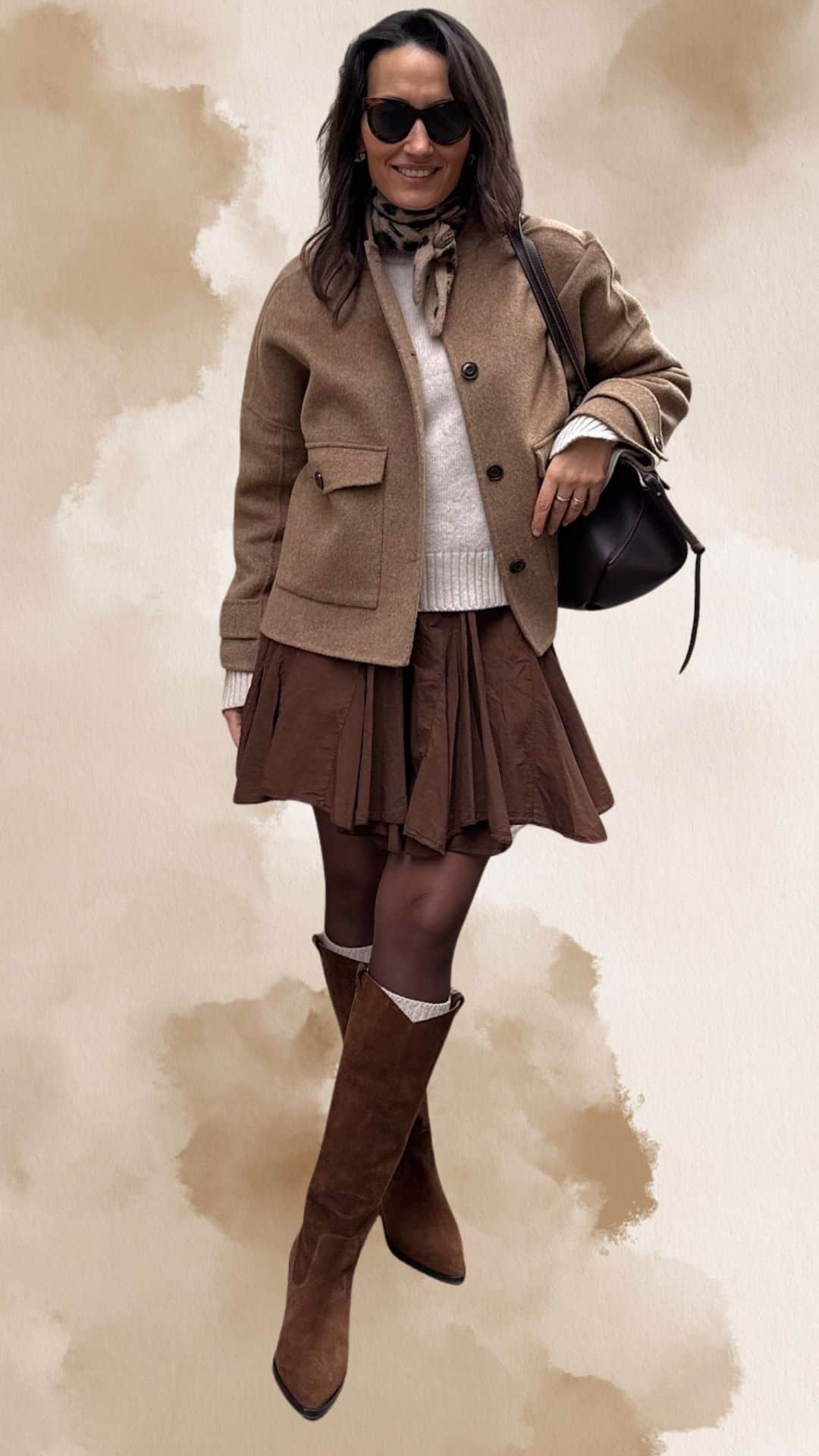 This chic brown skirt outfit combines a short, pleated brown skirt with a cozy cream sweater, perfect for an effortless yet stylish look.