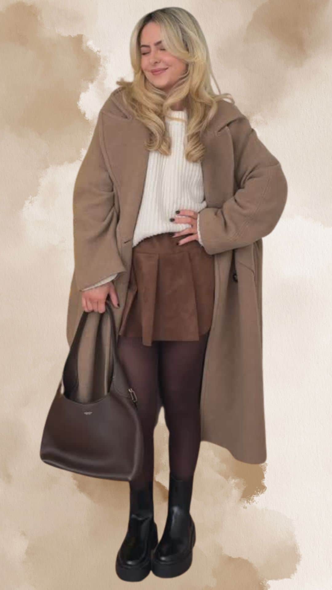Paired with a textured cream knit sweater and an oversized light brown coat, it’s a chic choice for any occasion.