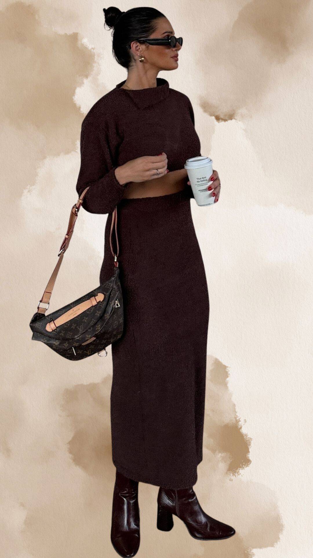 This brown skirt outfit effortlessly combines a fitted dark brown knit sweater with a matching long skirt, creating a seamless and elegant silhouette.