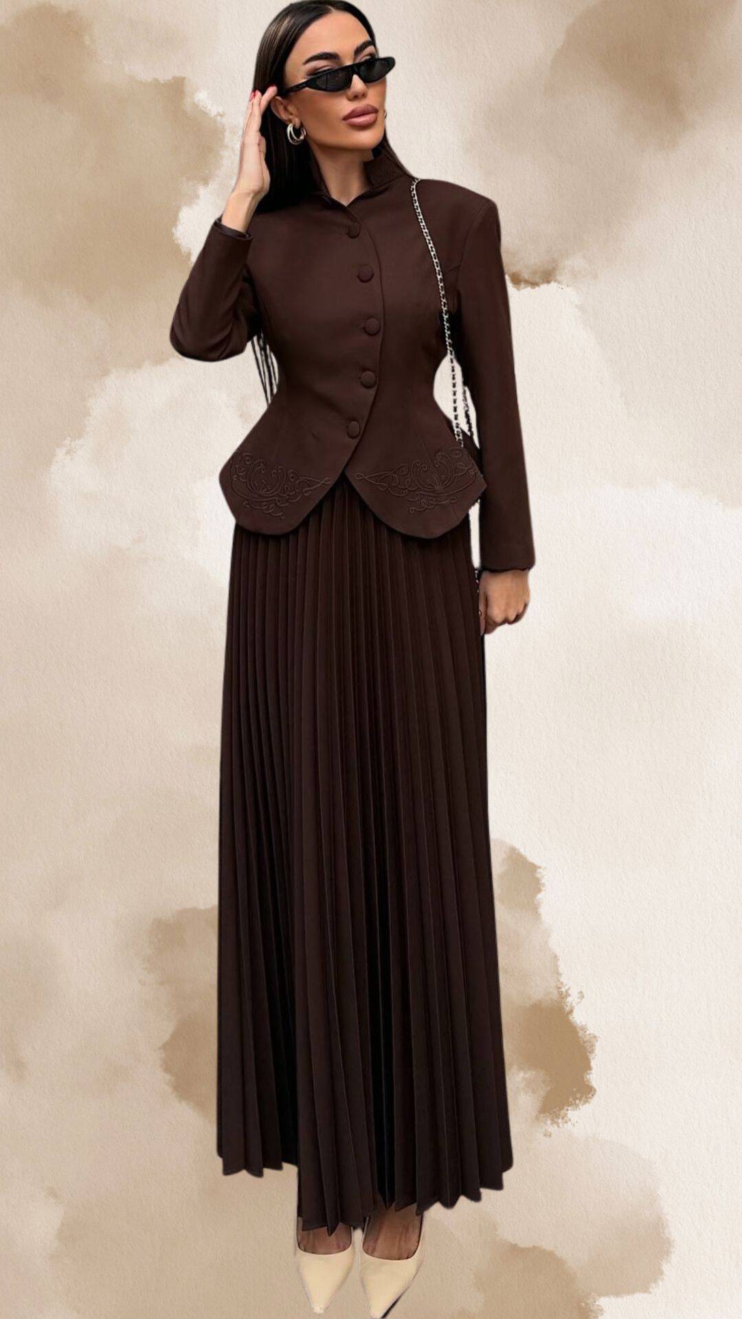 This stunning brown skirt outfit features a tailored jacket adorned with intricate embroidery, perfect for those who appreciate detailed craftsmanship.