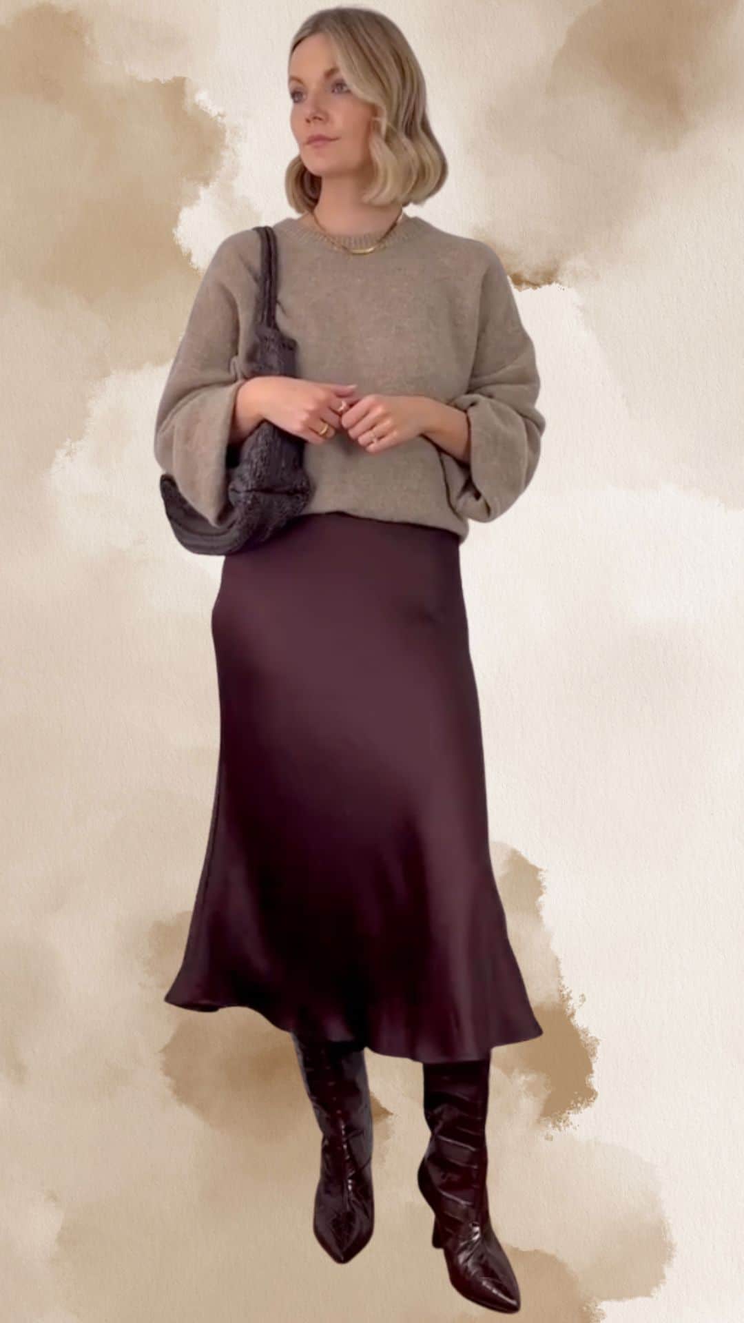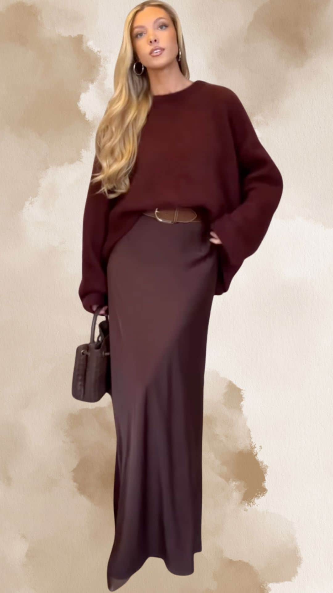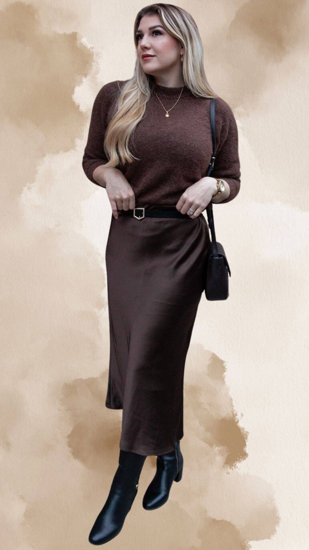 This stunning outfit showcases how to pair a chunky ribbed cocoa-brown sweater with a sleek satin chocolate-brown skirt.