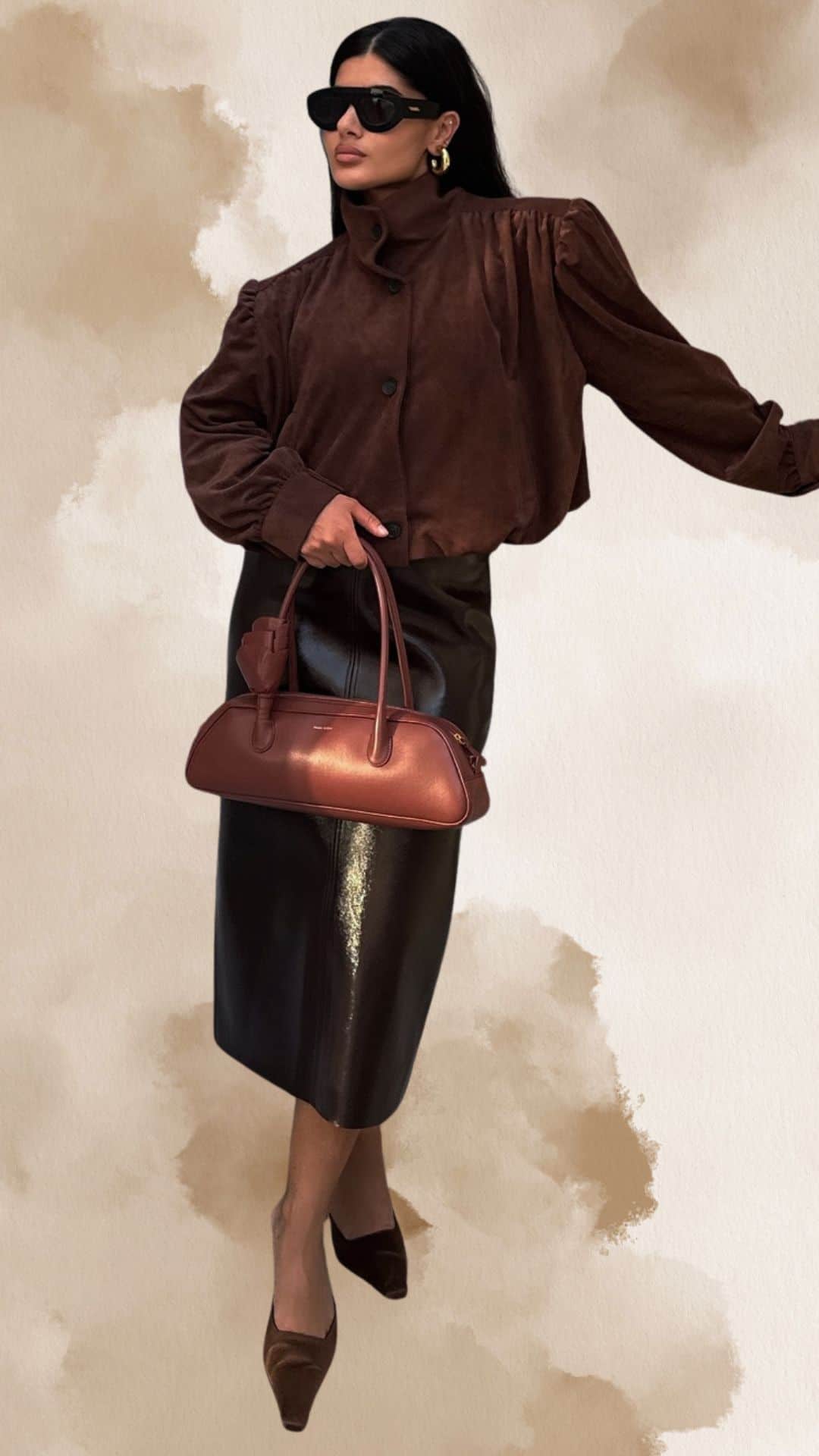 The rich, dark brown suede puff-sleeve blouse adds a touch of elegance and sophistication while pairing beautifully with the sleek glossy midi skirt.