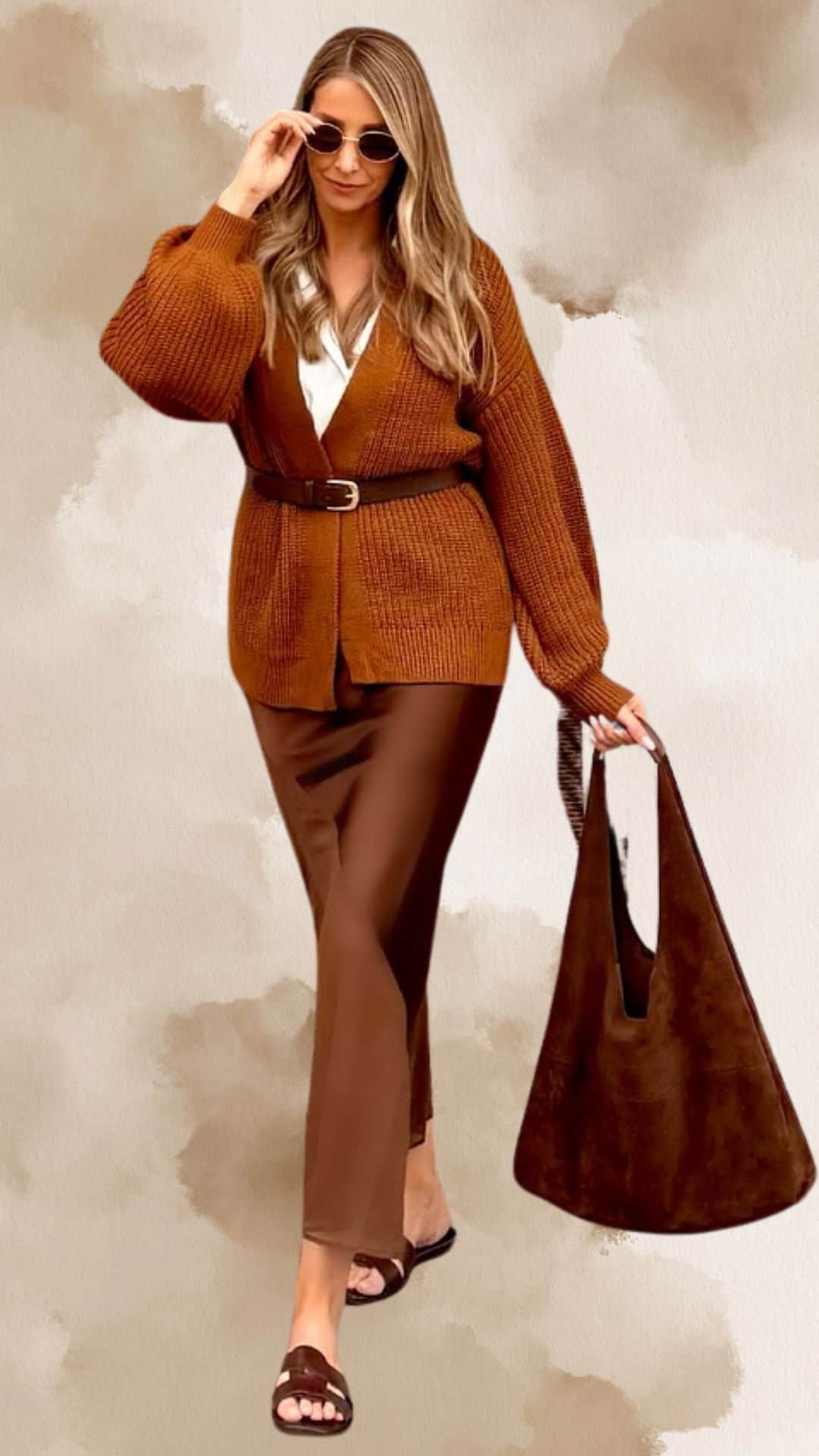 This brown skirt outfit showcases the perfect balance of comfort and style, featuring a textured rust-brown oversized cardigan that’s cinched at the waist with a dark brown belt for added definition.