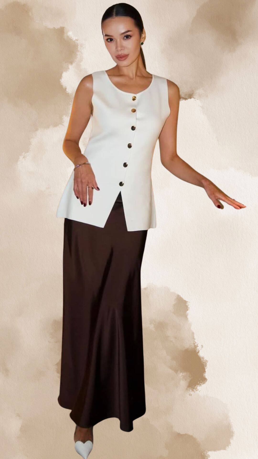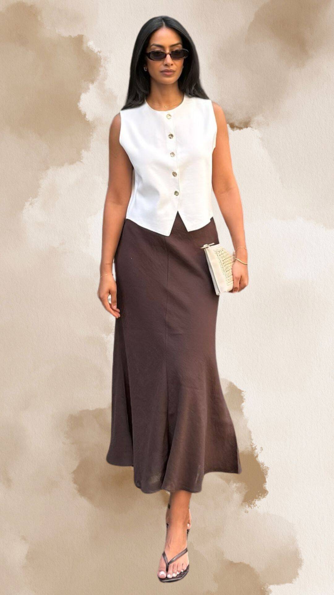 This chic brown skirt outfit features a fitted dark chocolate vest adorned with stylish button details, creating a striking silhouette against the flowy lighter brown maxi skirt.