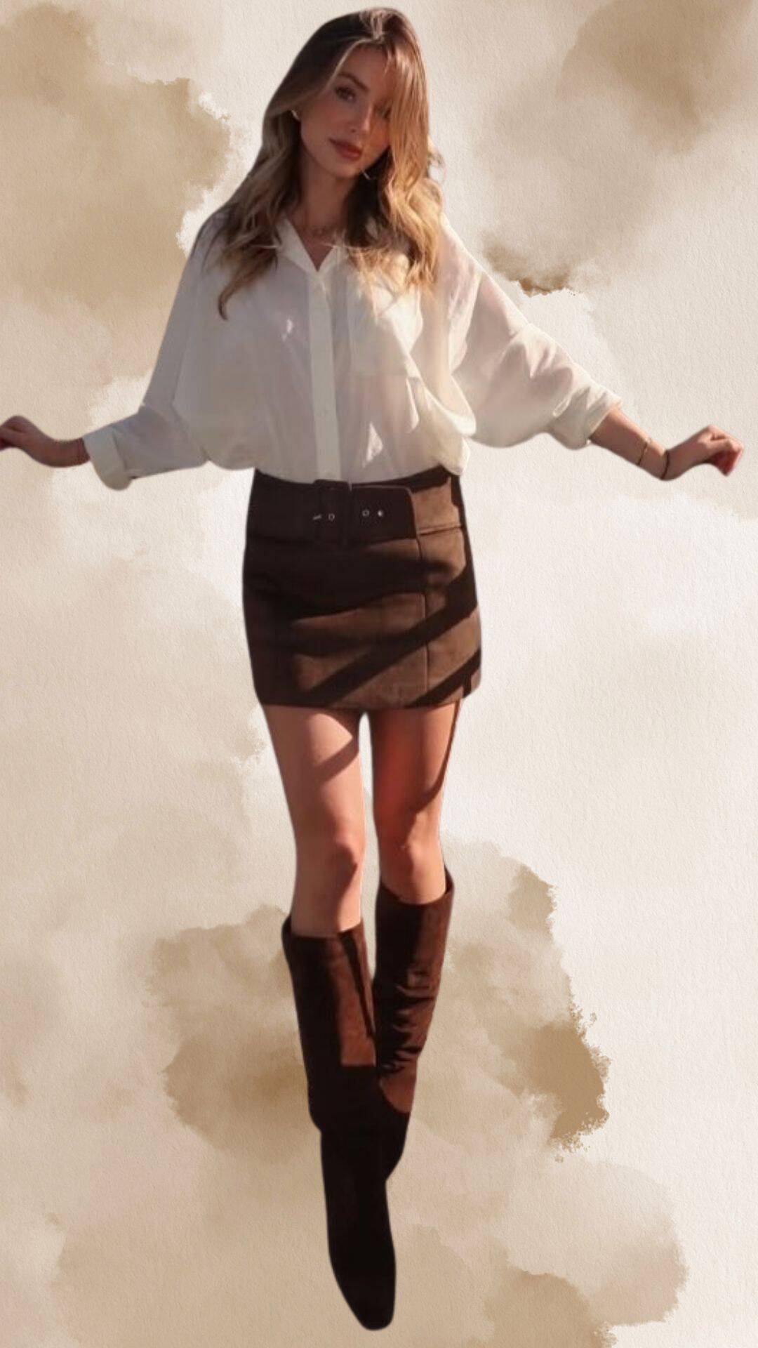 Complete the look with knee-high brown suede boots, which seamlessly meld with the skirt, adding height and elegance.