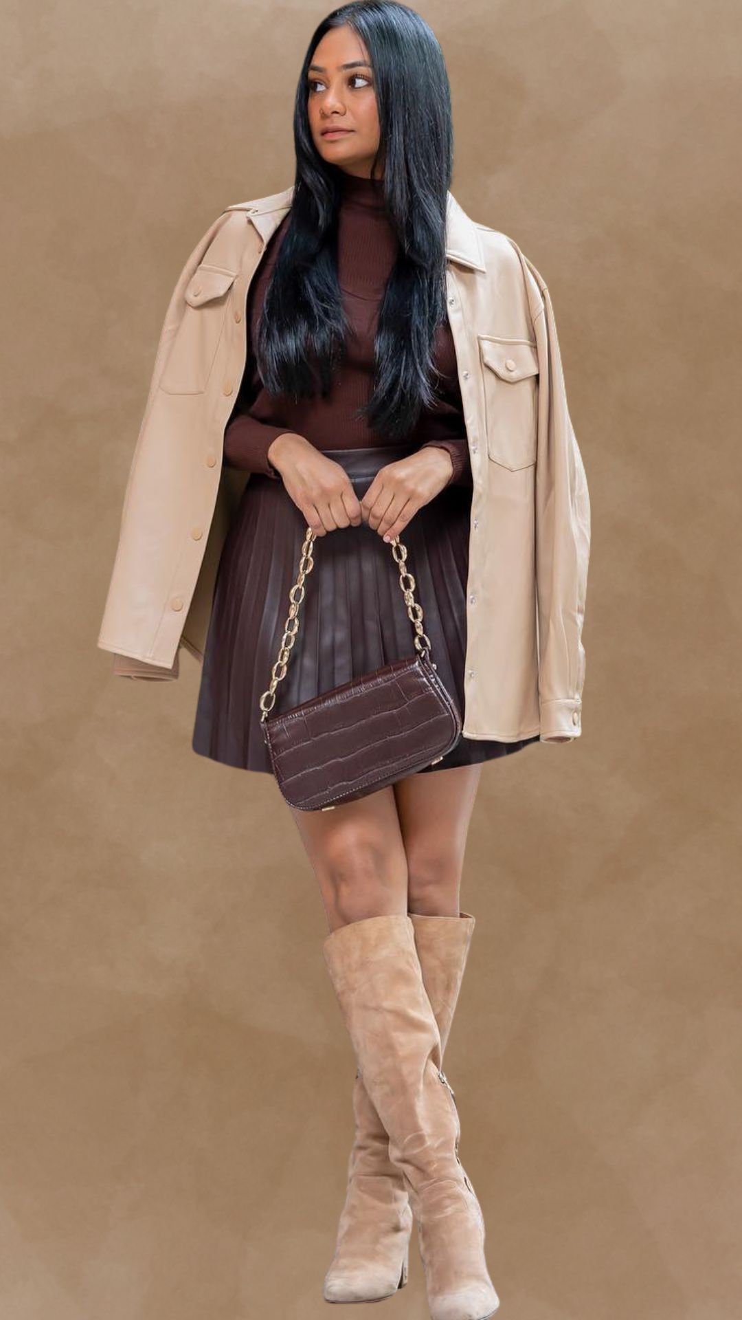 Paired with a pleated brown mini skirt and light taupe suede knee-high boots, this look exudes seasonal charm.