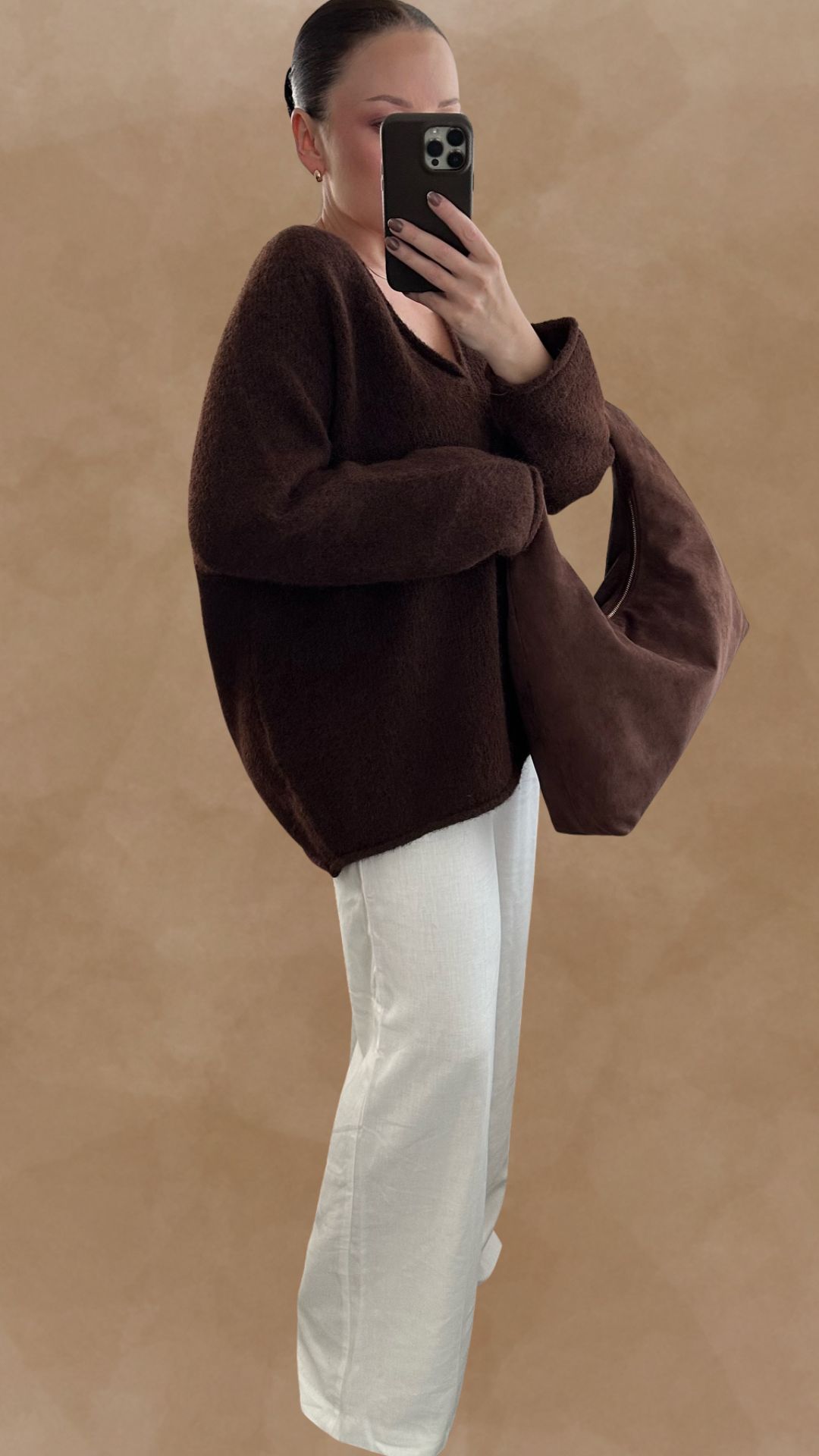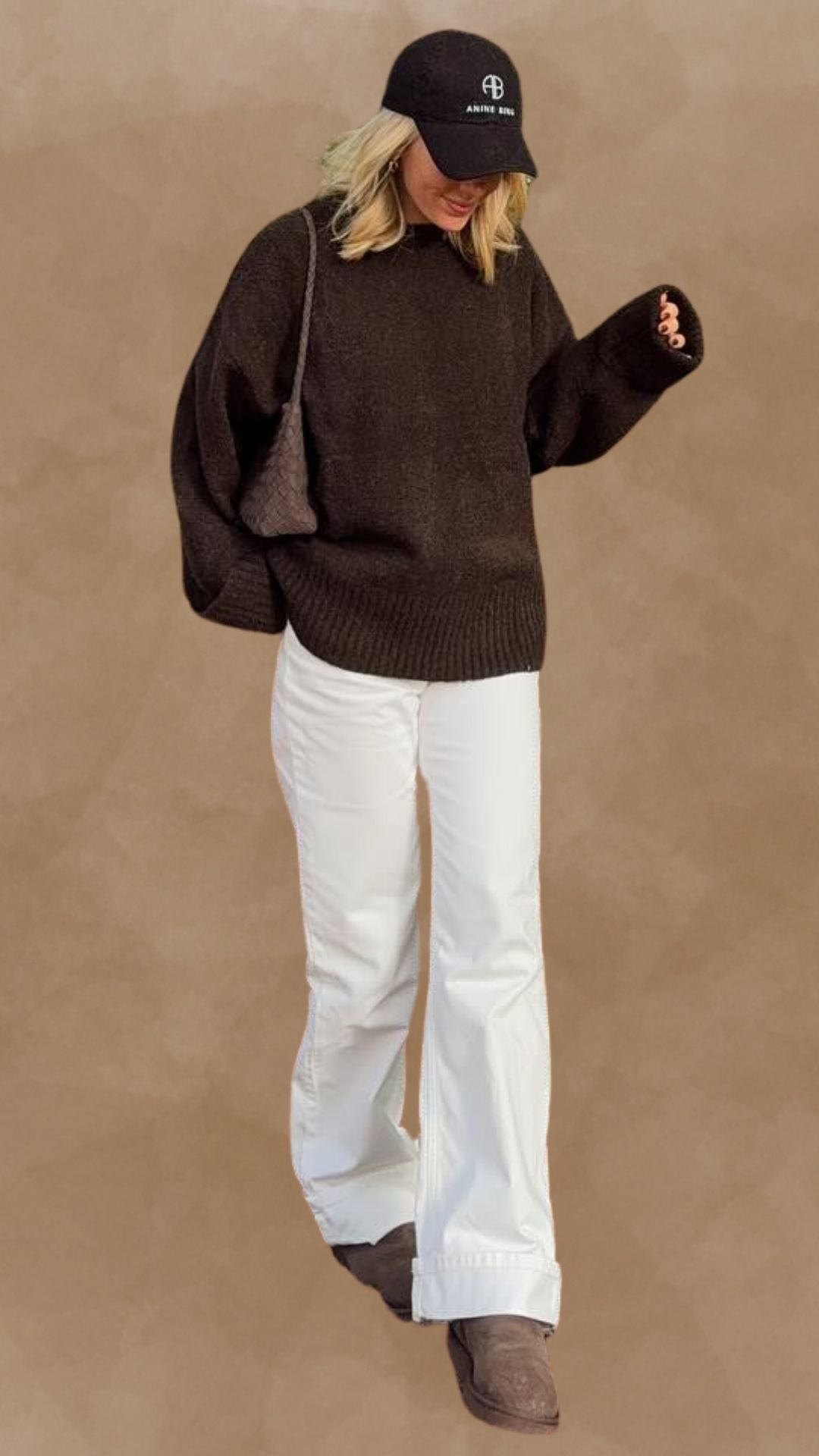This cozy brown sweater outfit is ideal for chilly fall and winter days, featuring a soft, oversized design that envelops you in warmth.