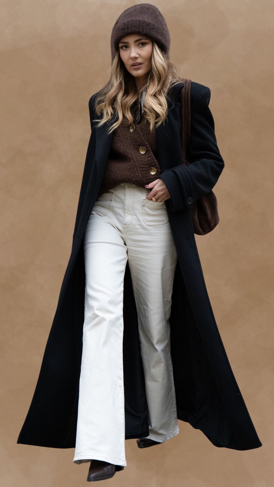 The combination of high-waisted white flared jeans and ankle boots creates a polished yet relaxed vibe, while the brown beanie ties the look together with a touch of flair.