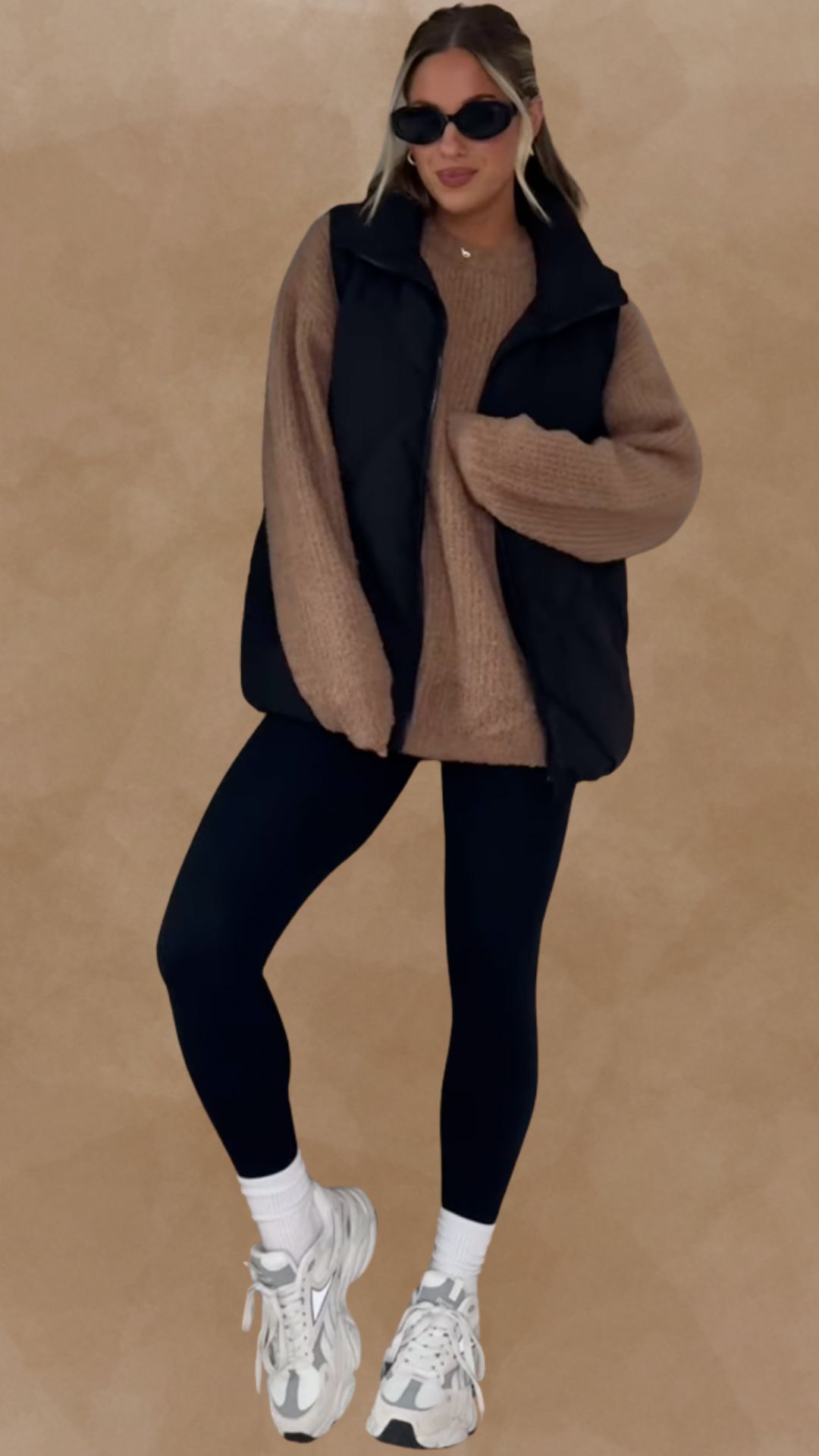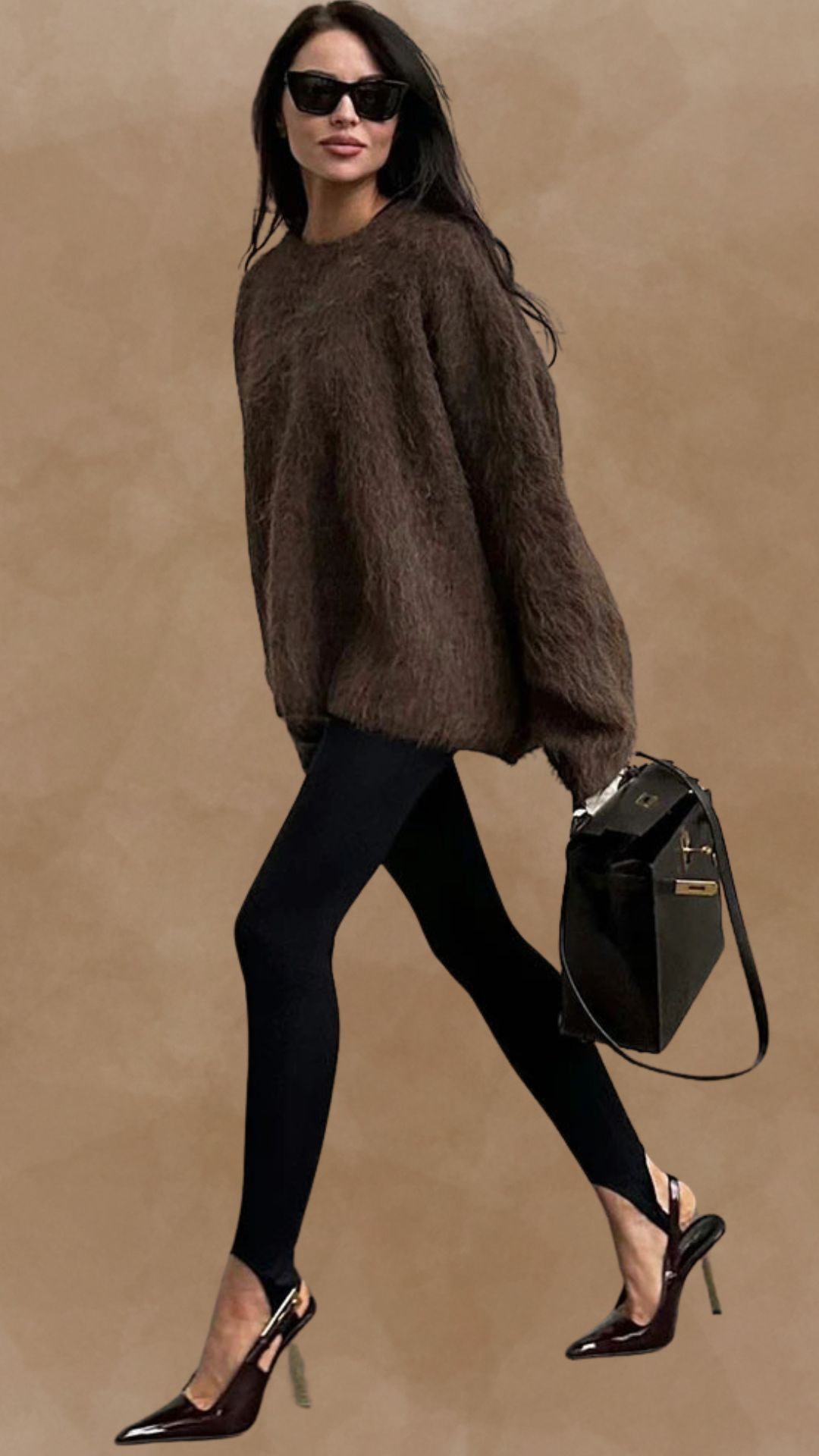 The oversized, textured brown sweater provides comfort while the sleek black leggings offer a streamlined silhouette.