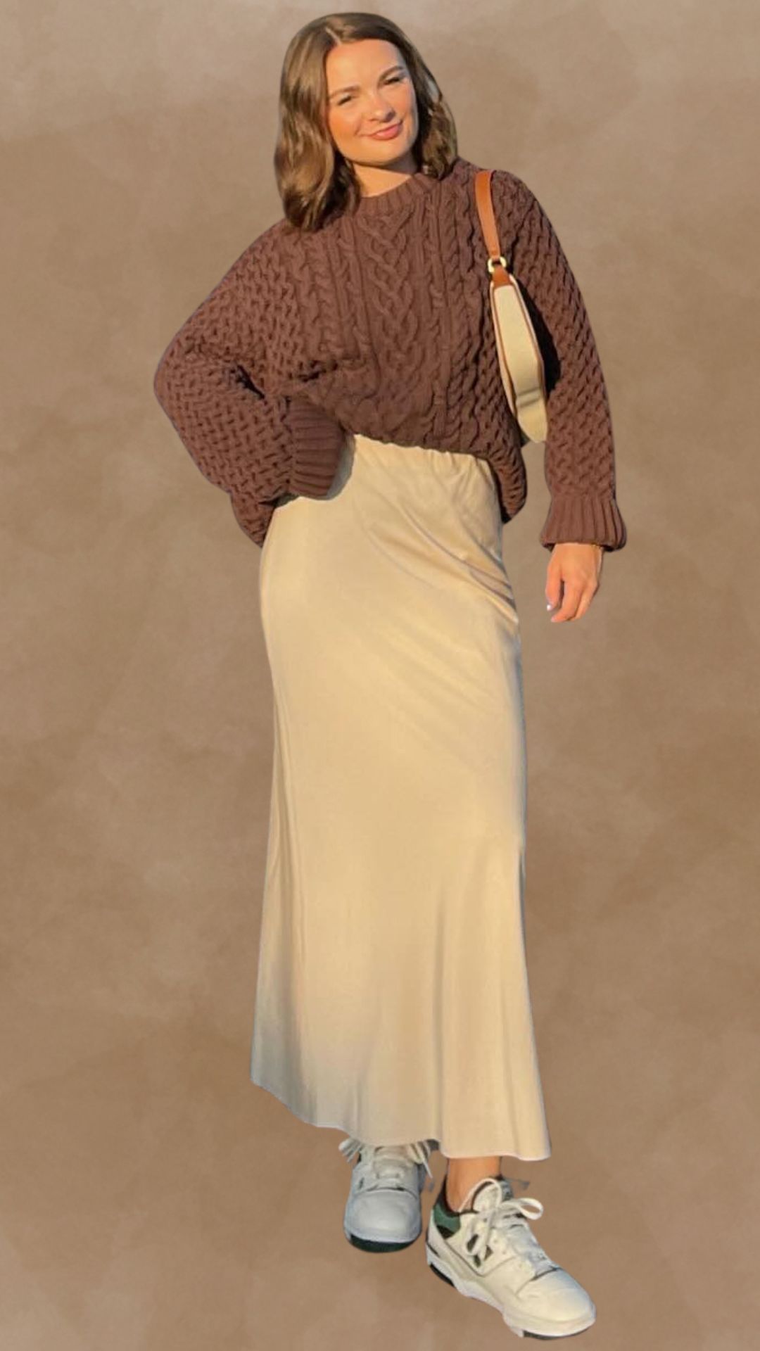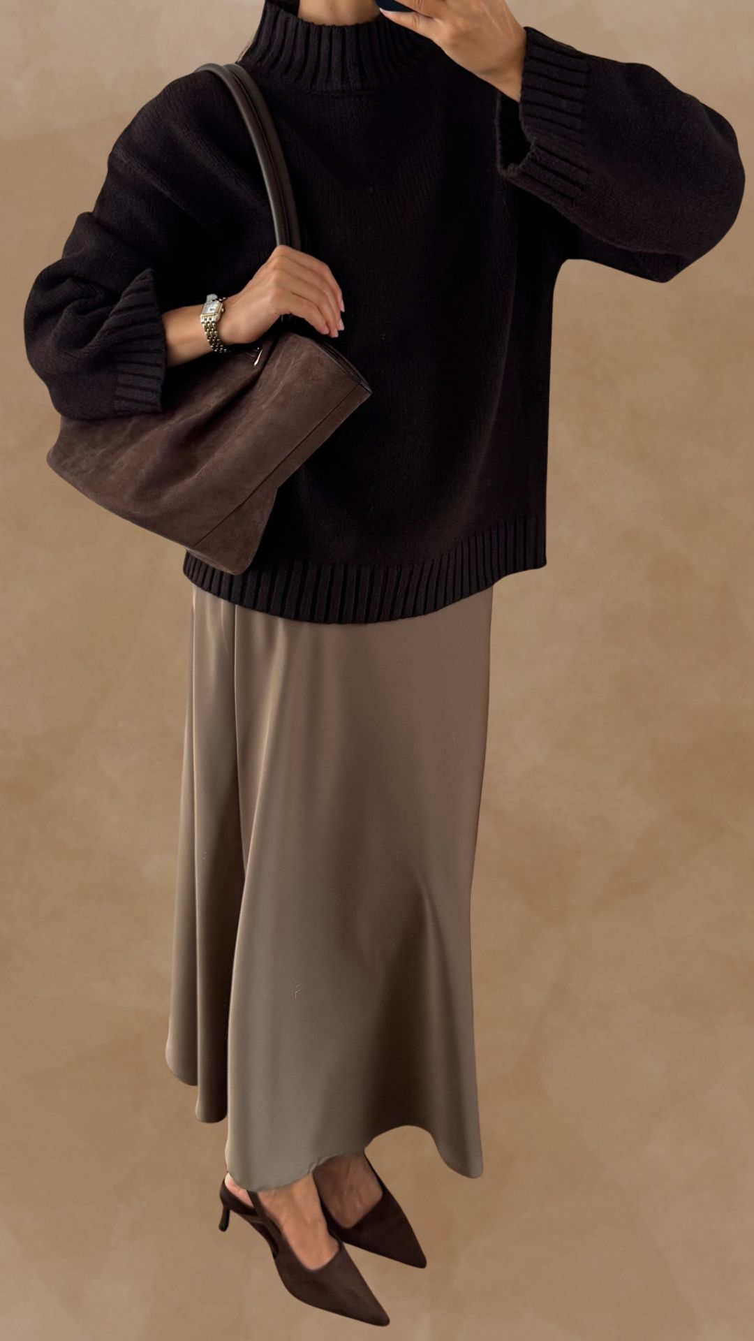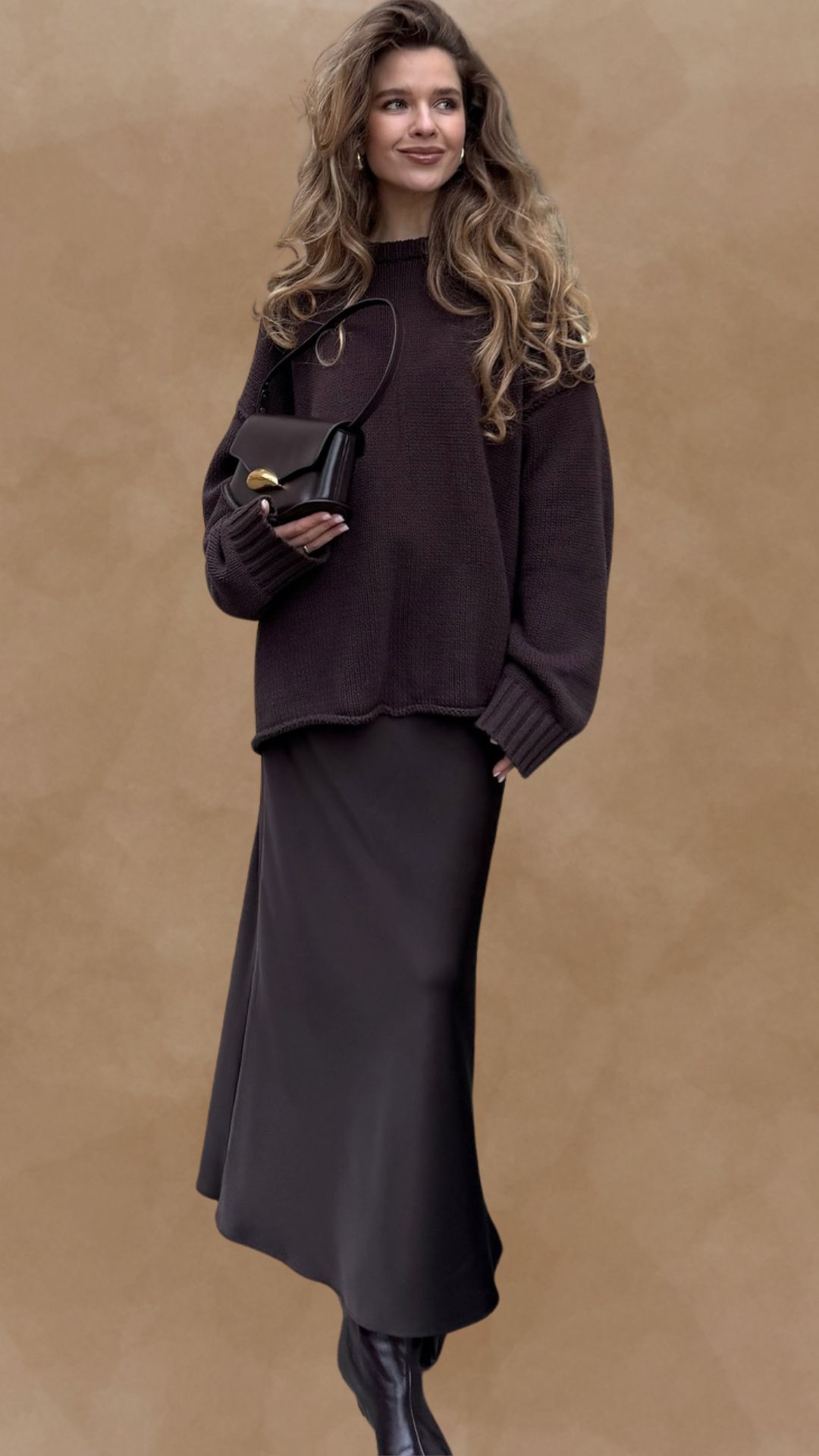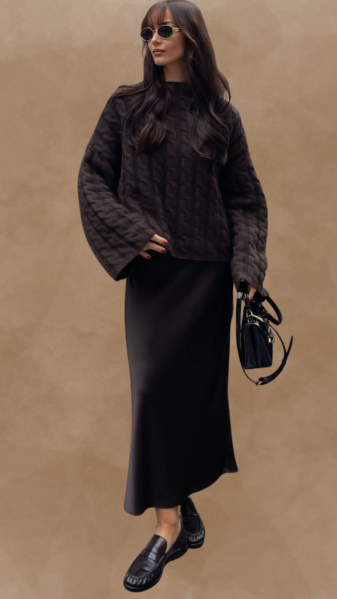 The oversized, textured sweater contrasts beautifully with the sleek dark brown satin midi skirt, creating a sophisticated silhouette.