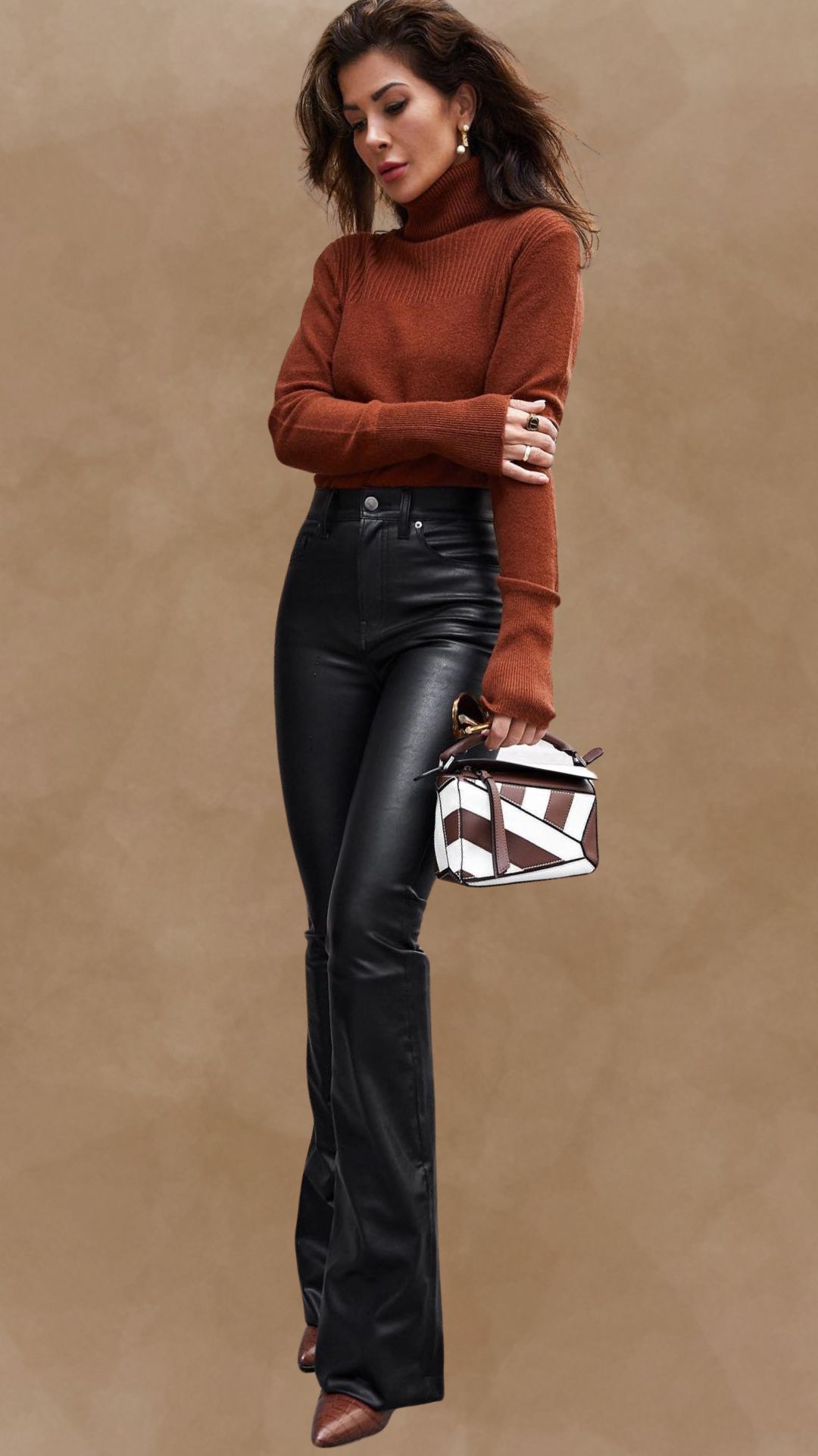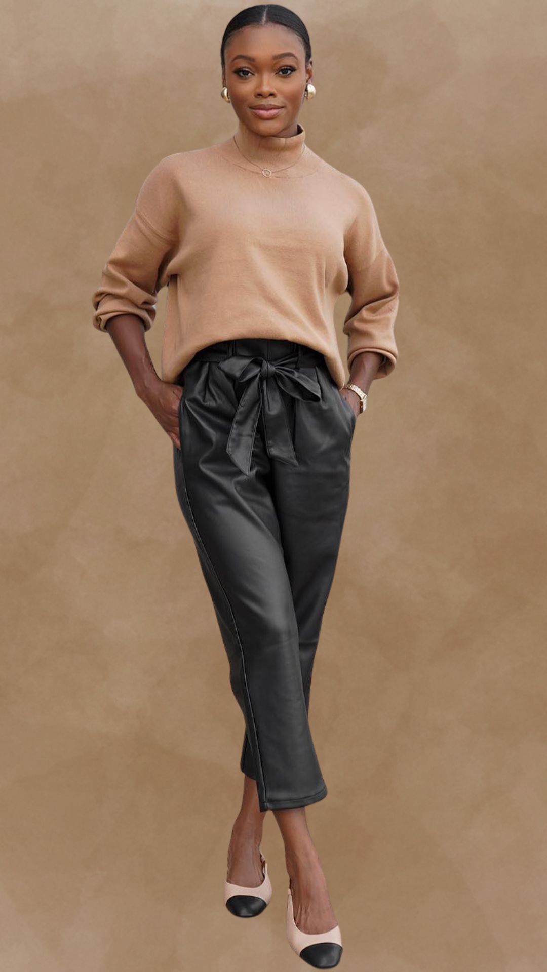 Brown Sweater Outfit With Chic High-Waisted Faux Leather Trousers