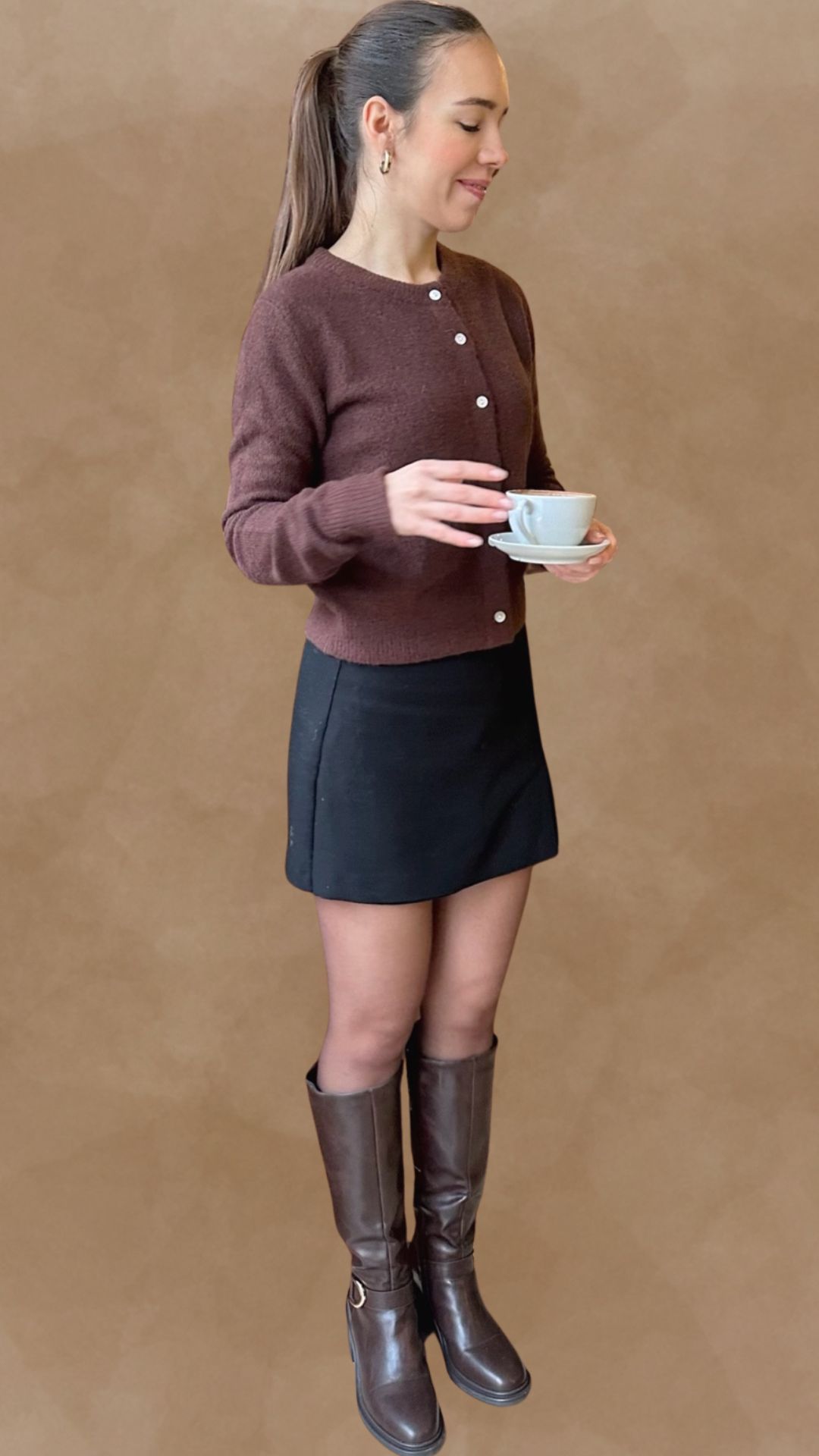 The delicate white buttons add a charming detail, while the sleek black mini skirt creates a chic contrast that elevates your winter wardrobe.