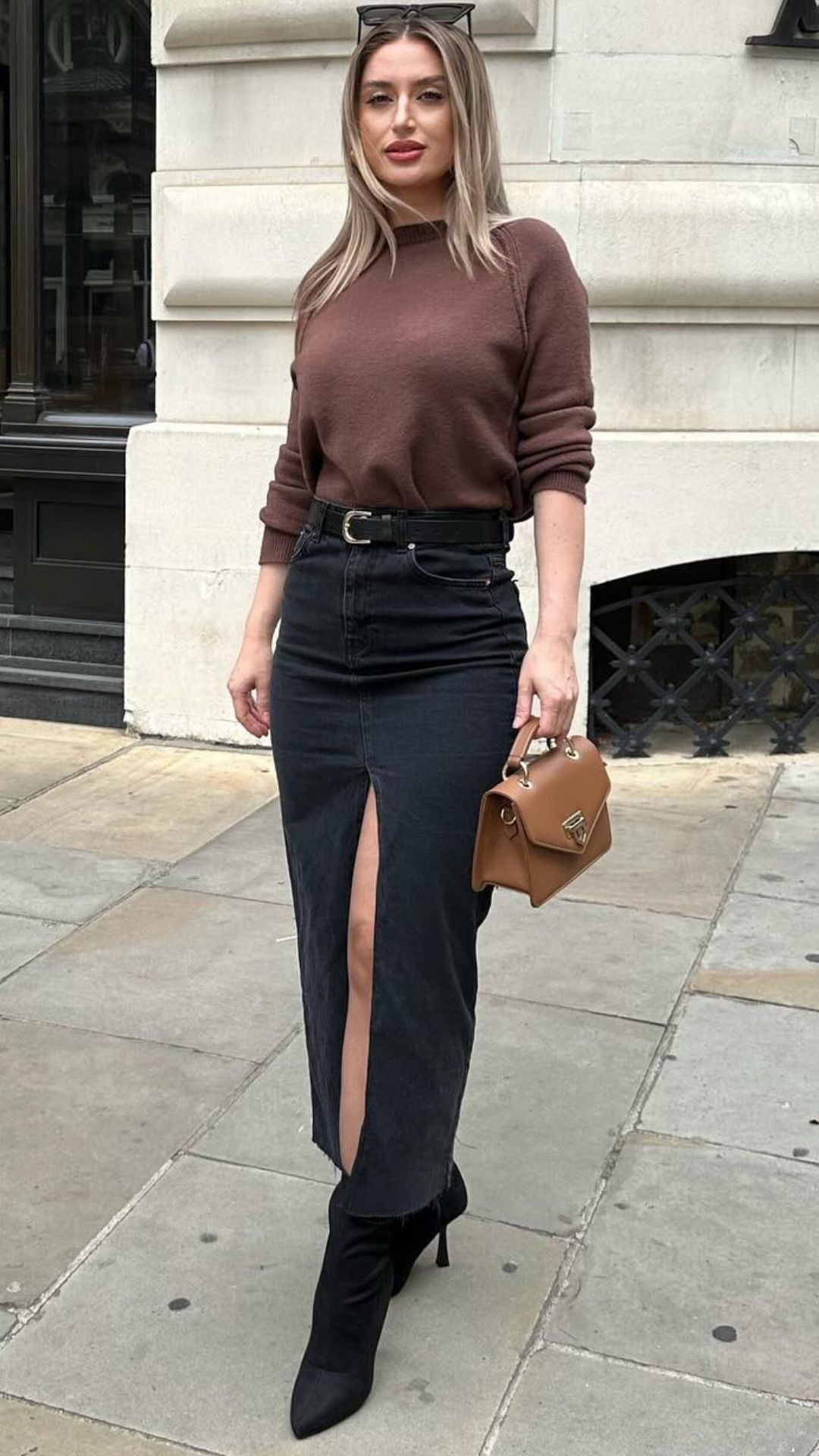 Brown Sweater Outfit With Side Slit Black Denim Skirt