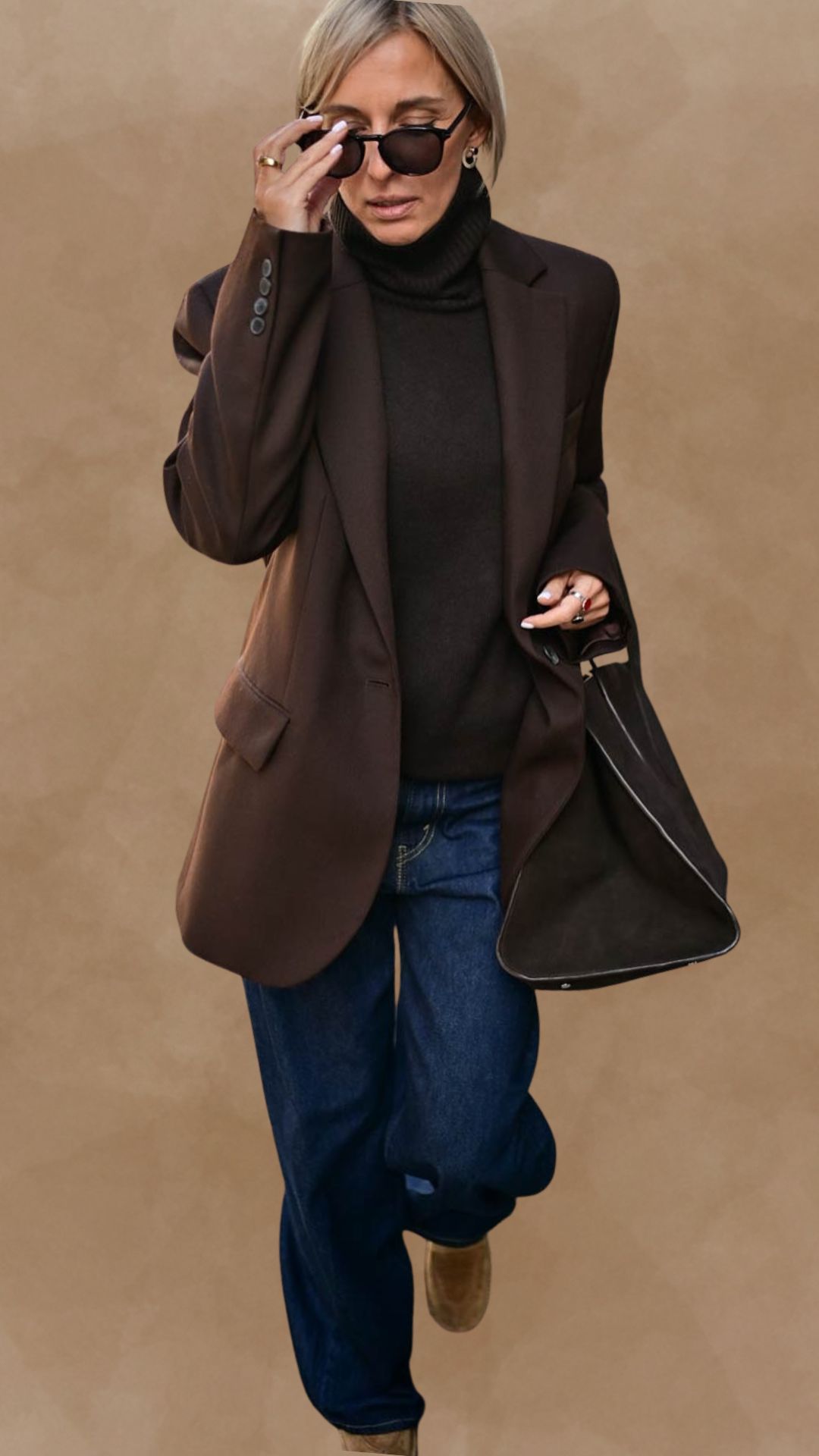 This brown sweater outfit is ideal for embracing the cozy vibes of fall and winter. The warm turtleneck, layered under a structured oversized blazer, offers both style and comfort.
