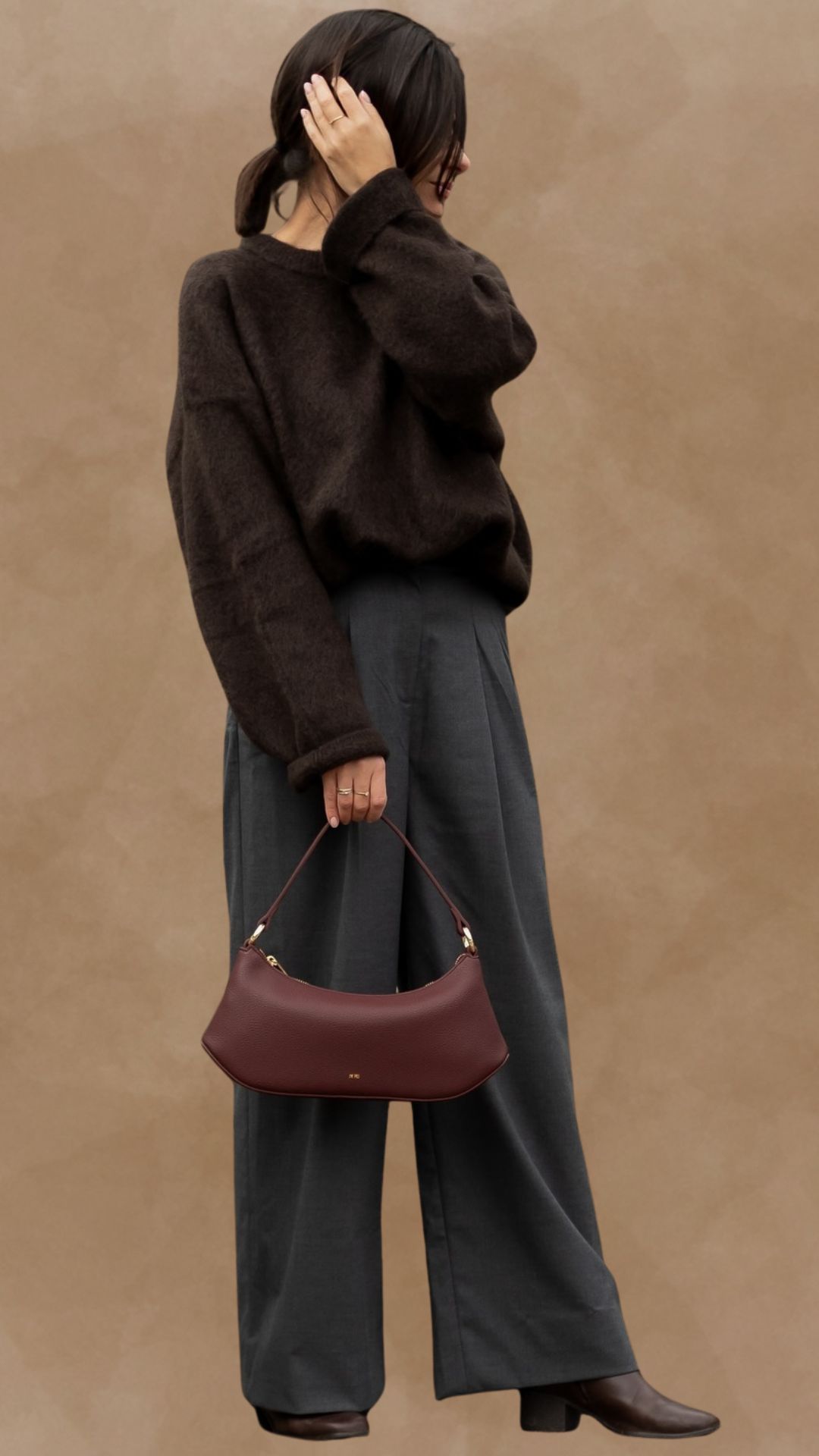 The sleek burgundy handbag adds a touch of sophistication, making it an ideal choice for both casual outings and more polished events.