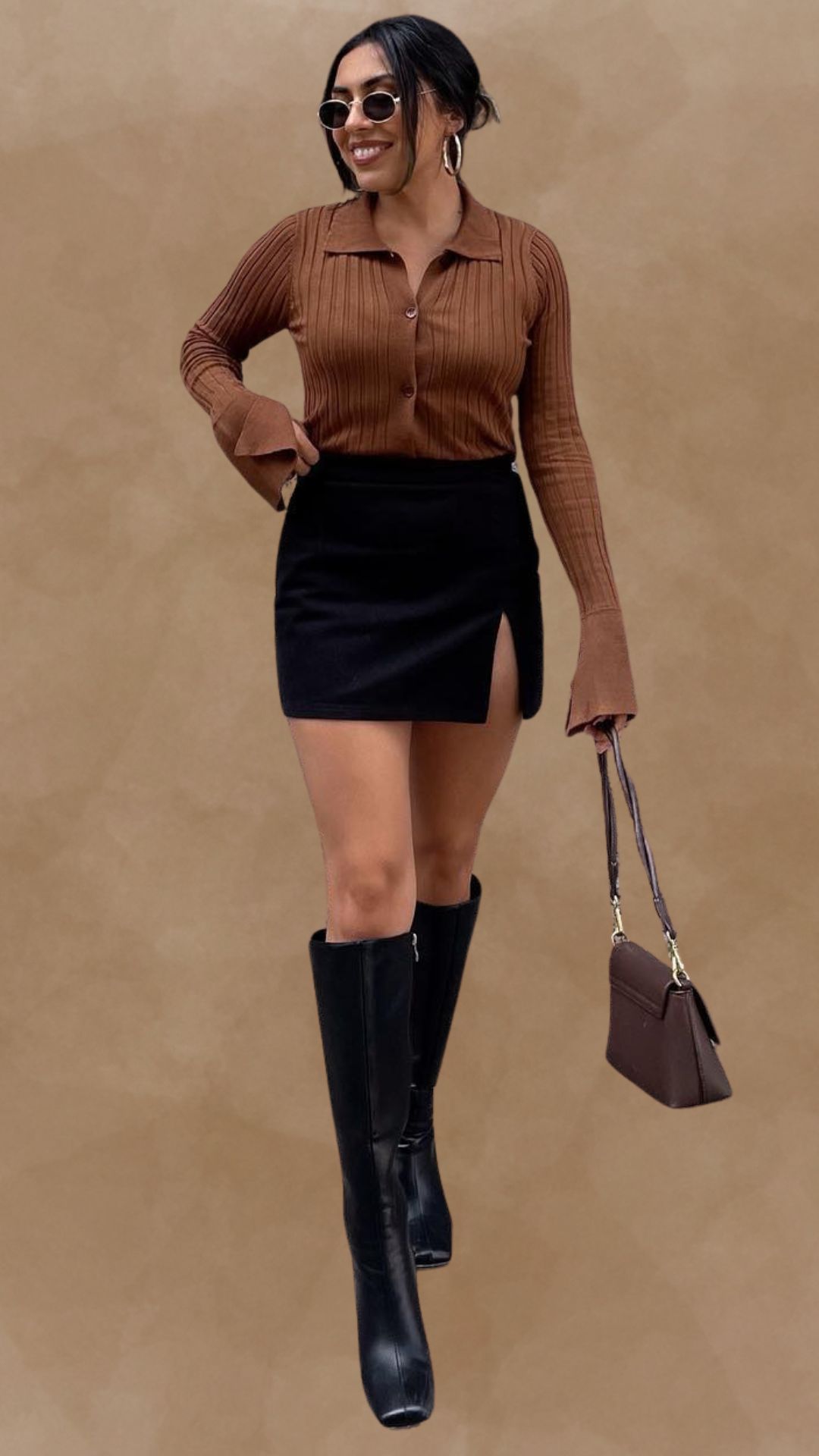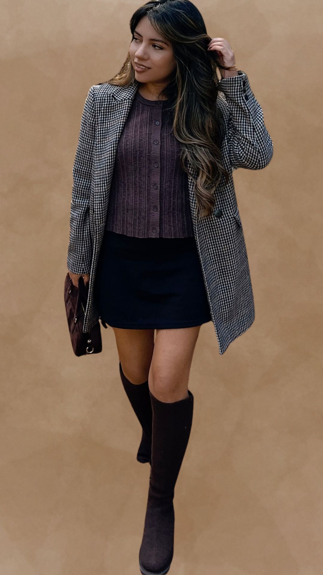 The sleek black mini skirt and knee-high heeled boots elevate the look, making it ideal for both casual outings and dressier occasions.