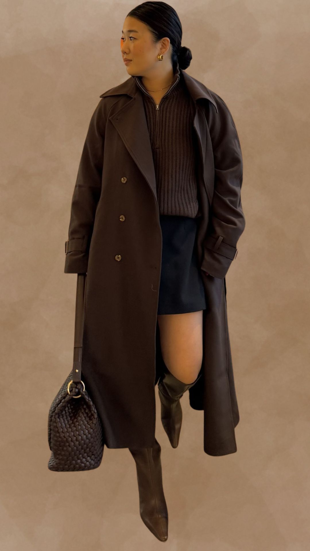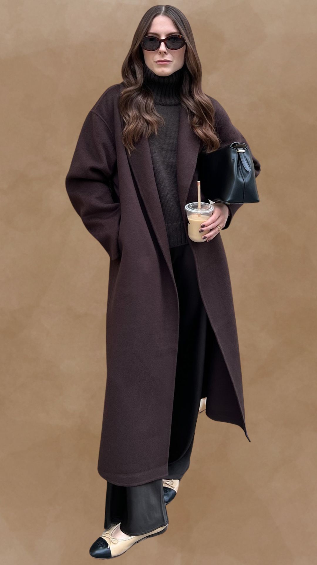 The fitted brown turtleneck and oversized beige jacket offer a comfortable layer against chilly weather.