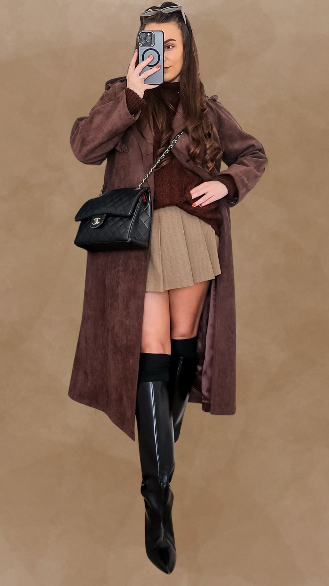 Complete your look with the matching brown suede handbag, perfect for carrying essentials while enhancing your overall ensemble.