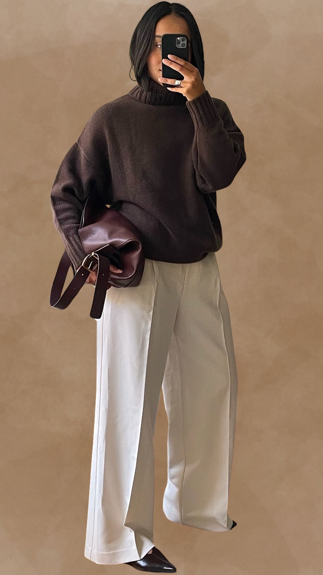 This chic brown sweater outfit combines a soft, dark turtleneck with high-waisted cream trousers for the ultimate in winter comfort.