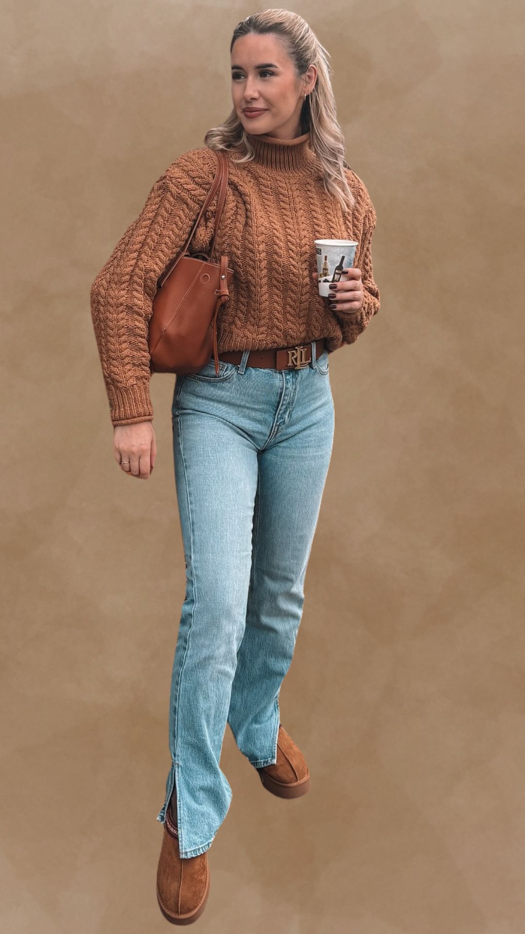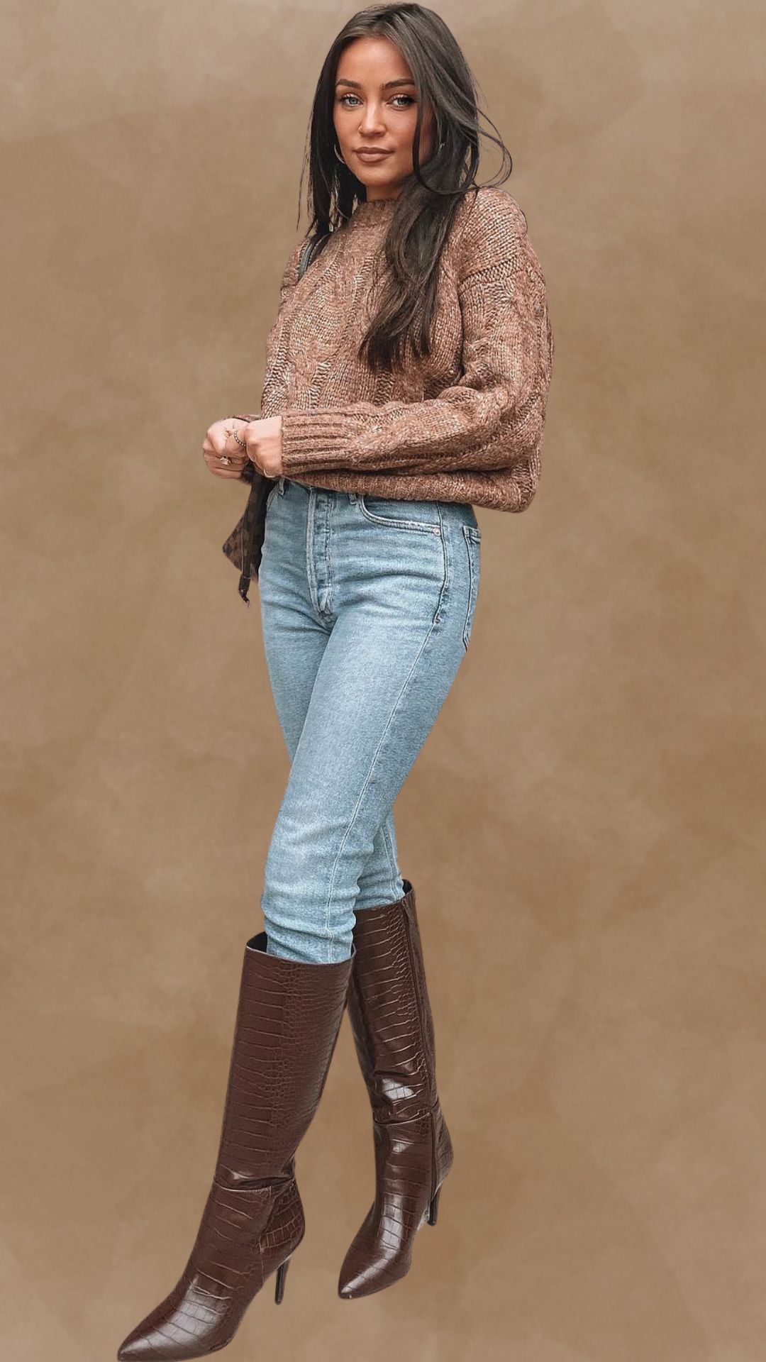 This chic brown sweater outfit is ideal for chilly fall and winter days, offering both comfort and style.