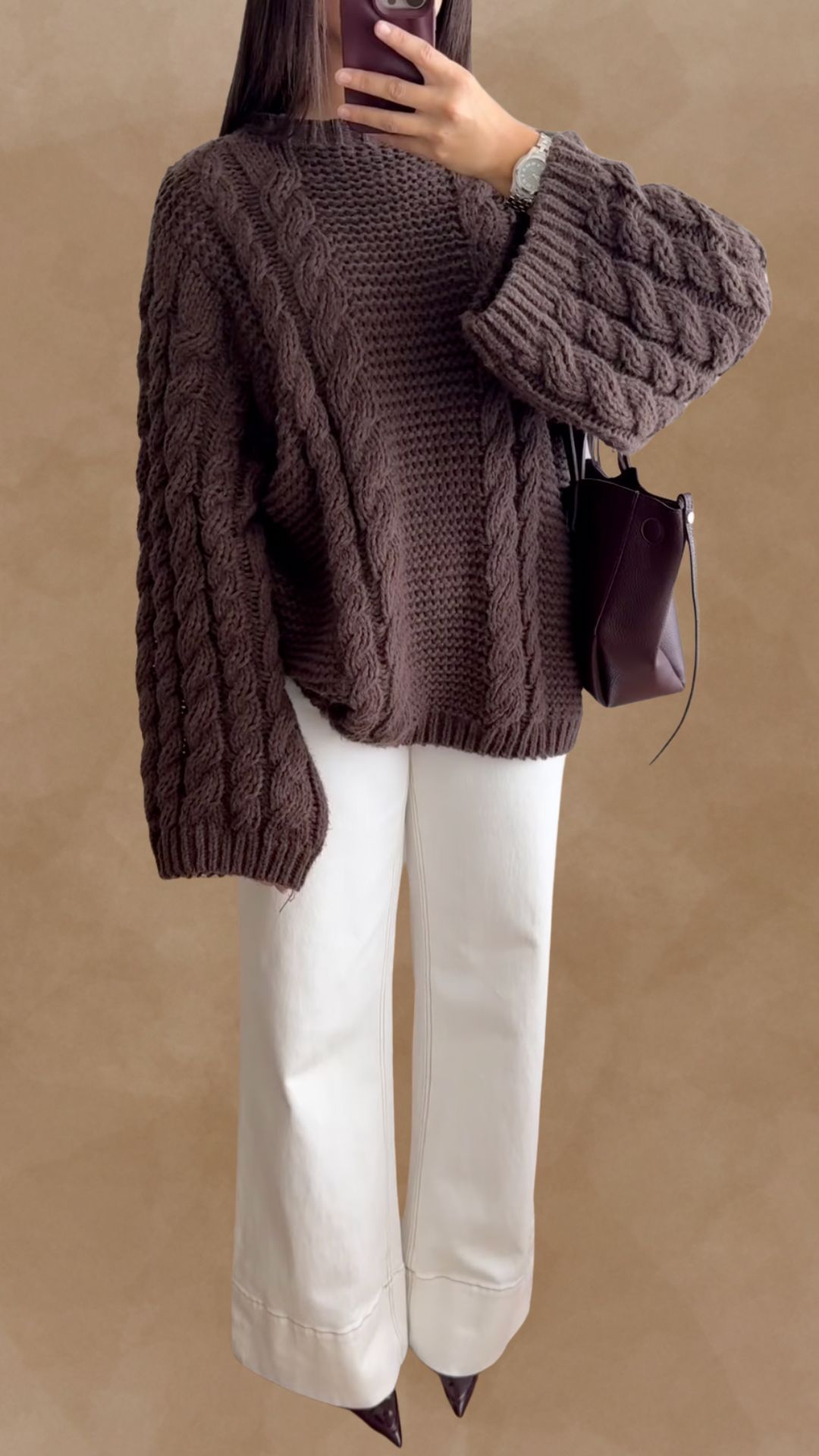 This cozy brown cable-knit sweater is a staple for chilly fall and winter days, providing warmth with its wide sleeves and textured finish.