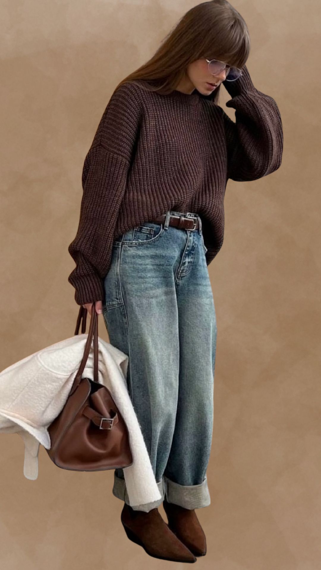 The oversized ribbed brown sweater pairs beautifully with light blue relaxed-fit jeans, rolled at the cuffs for an effortlessly casual vibe.