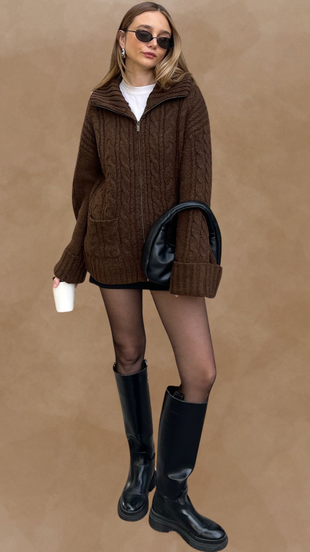 This cozy brown cardigan is an essential piece for cold weather fashion, combining comfort and style effortlessly.
