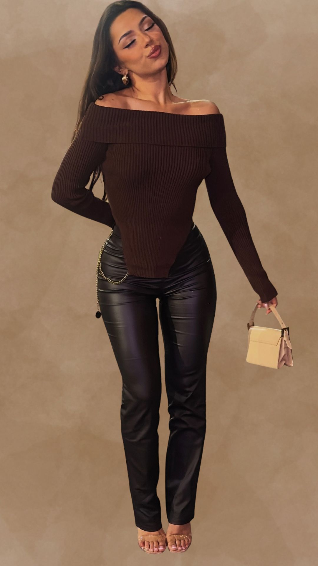 This chic brown sweater outfit is ideal for cozy fall and winter days. The off-the-shoulder design adds a flirtatious touch, making it both stylish and comfortable.