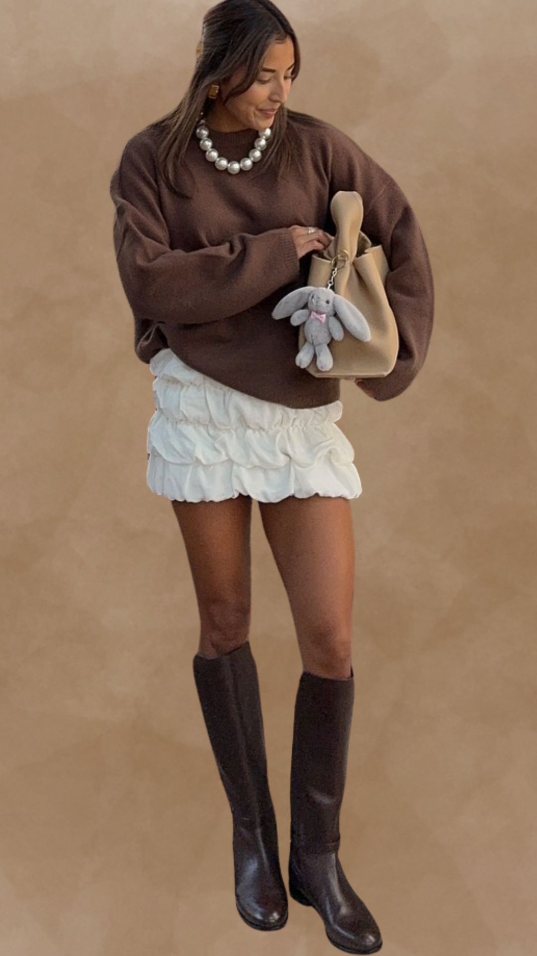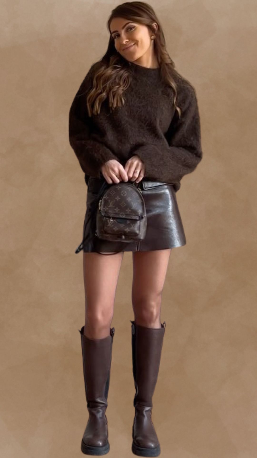 This brown sweater outfit showcases an inviting combination of a thick, fuzzy sweater and a sleek, dark brown leather mini skirt, perfect for chilly fall days.