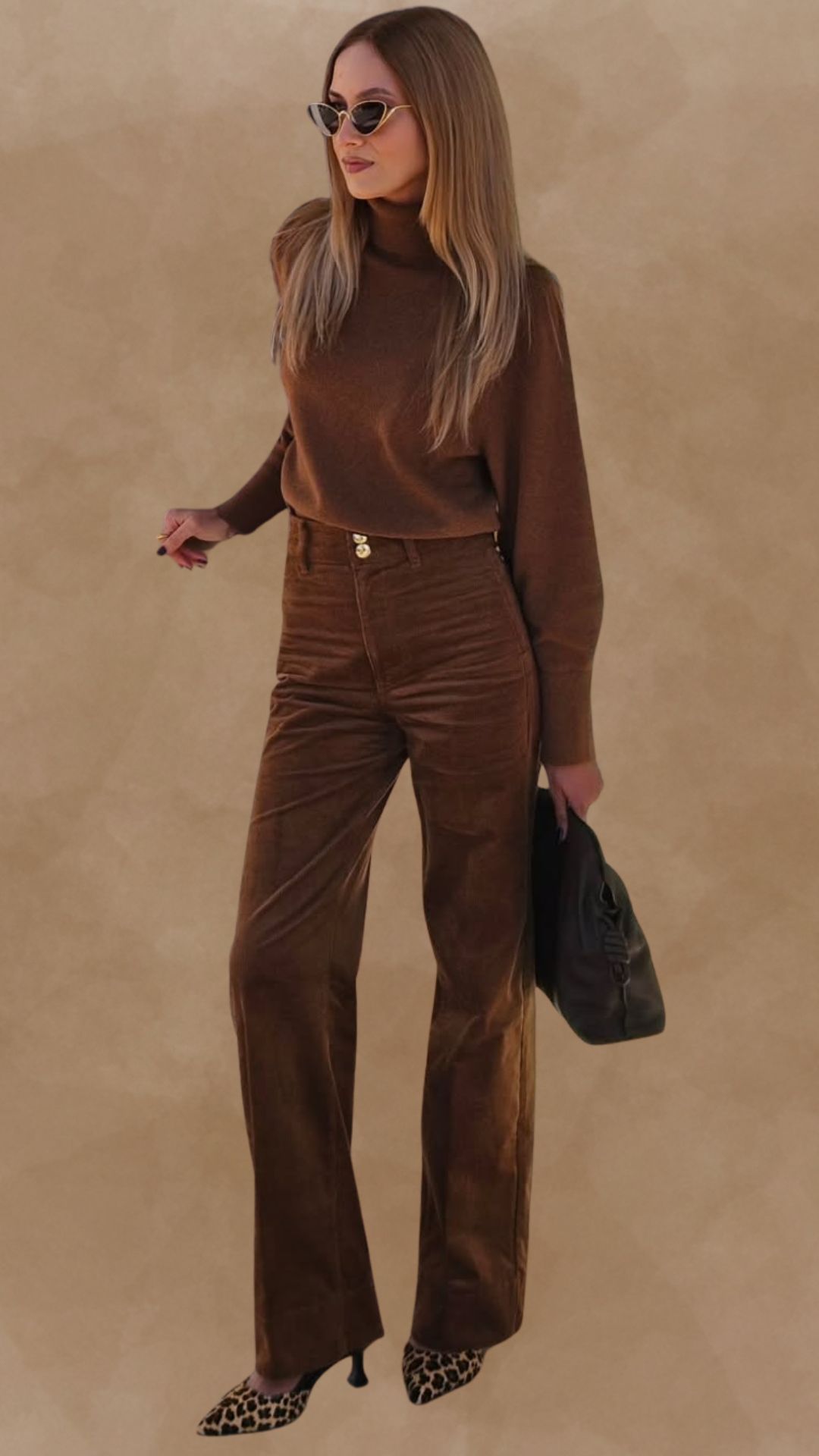 This cozy chocolate brown turtleneck sweater and matching flared corduroy pants create a fluid silhouette, ideal for chilly days.