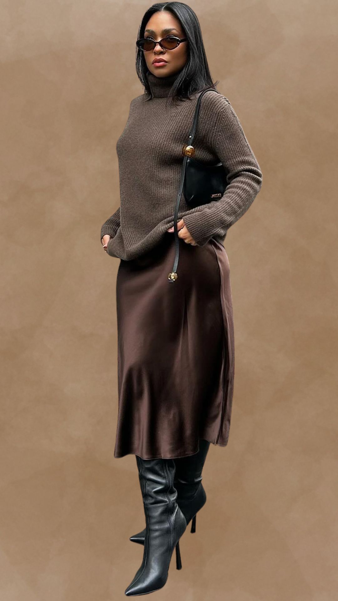 This brown sweater outfit elegantly combines a cozy ribbed turtleneck with a sumptuous silky midi skirt, creating a stylish layered look that’s ideal for chilly fall and winter days.