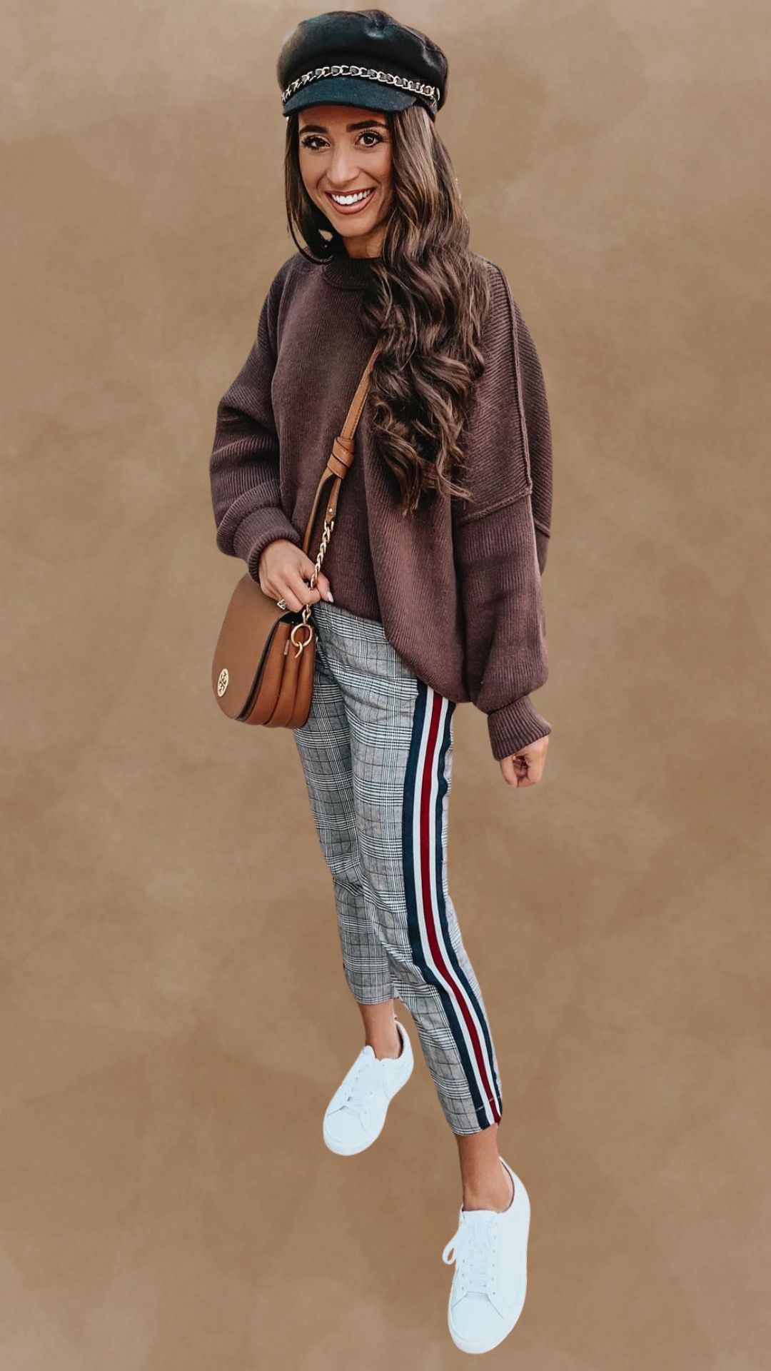 This cozy brown sweater outfit features a knit design that provides warmth while looking effortlessly stylish.