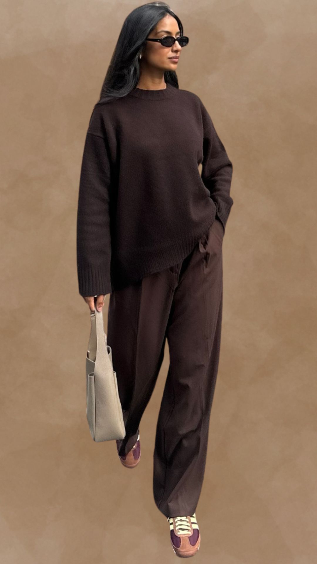 Brown Sweater Outfit With Cozy Oversized Knit and Tailored Trousers