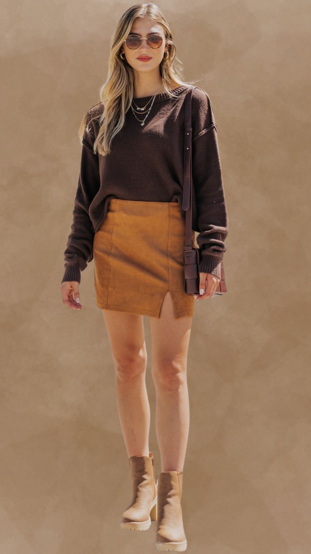 Paired with a warm tan suede mini skirt featuring a stylish side slit, this outfit balances comfort and trend effortlessly.