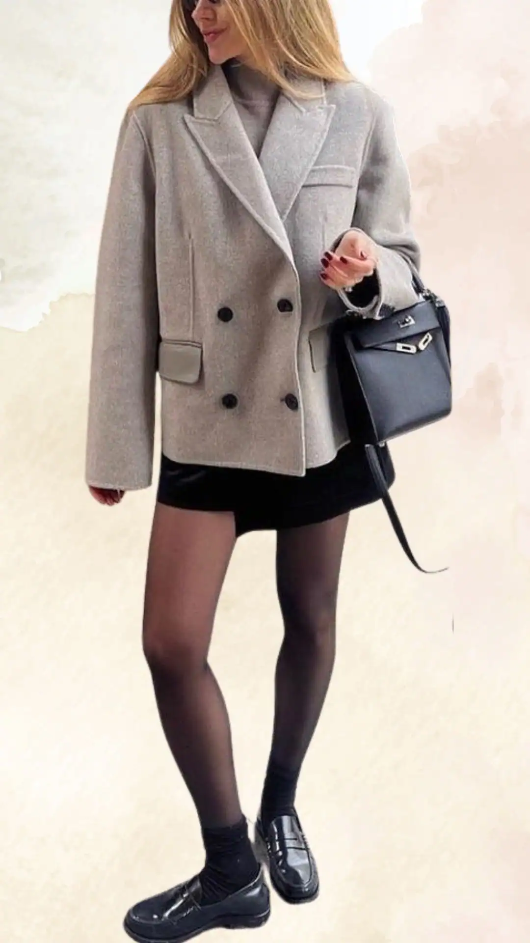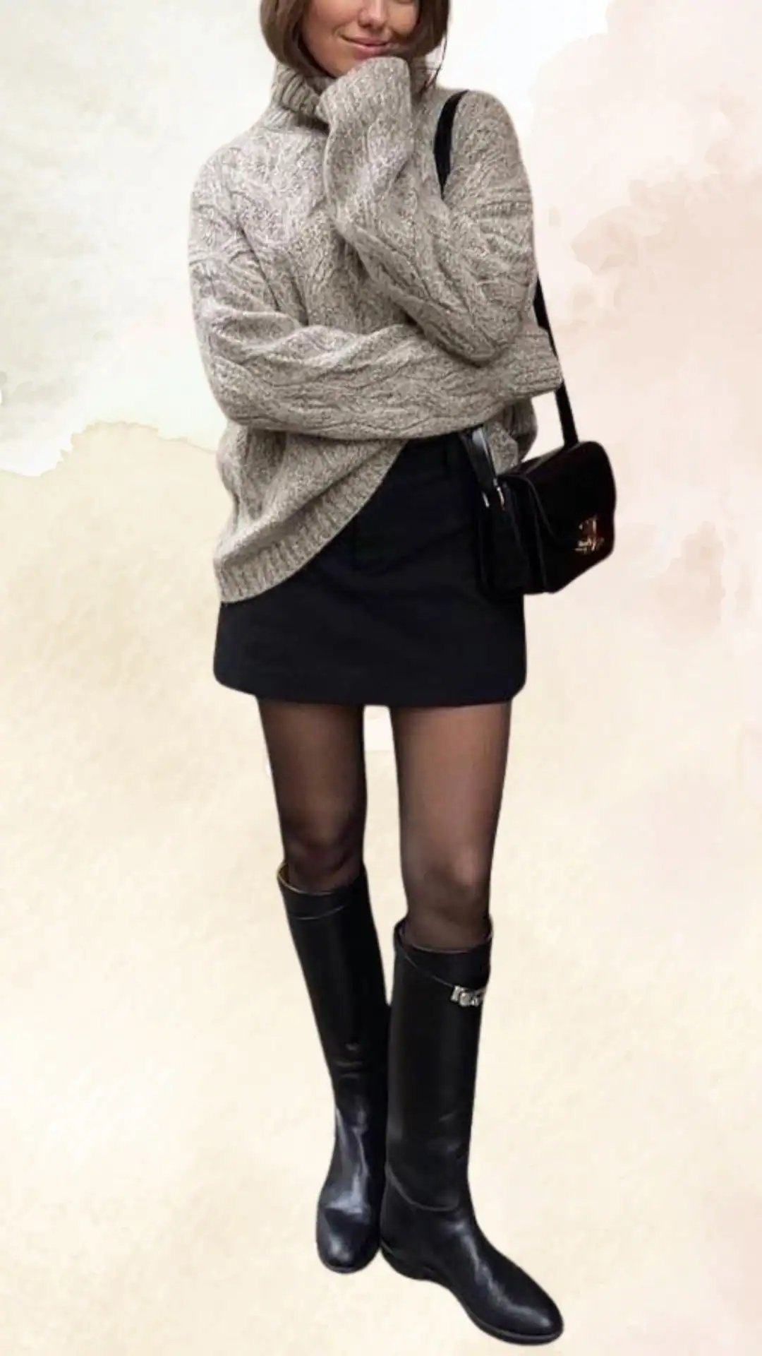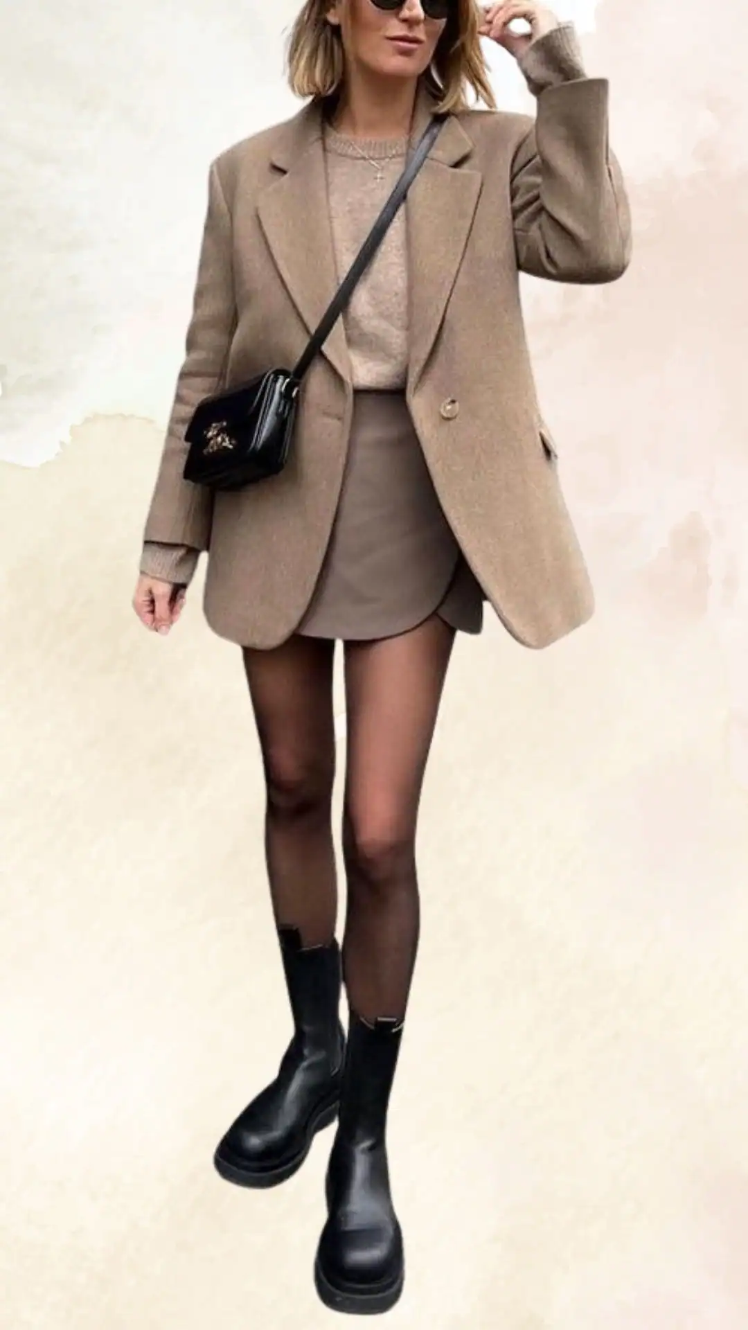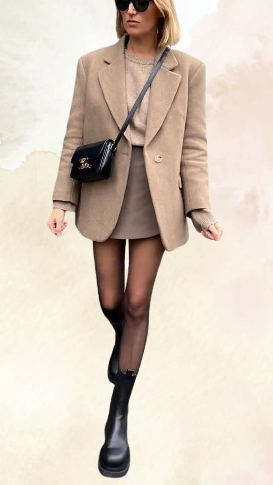 Underneath, a fitted beige sweater offers warmth while maintaining a sophisticated edge. The tailored black mini skirt adds a touch of modernity, creating a flattering silhouette.