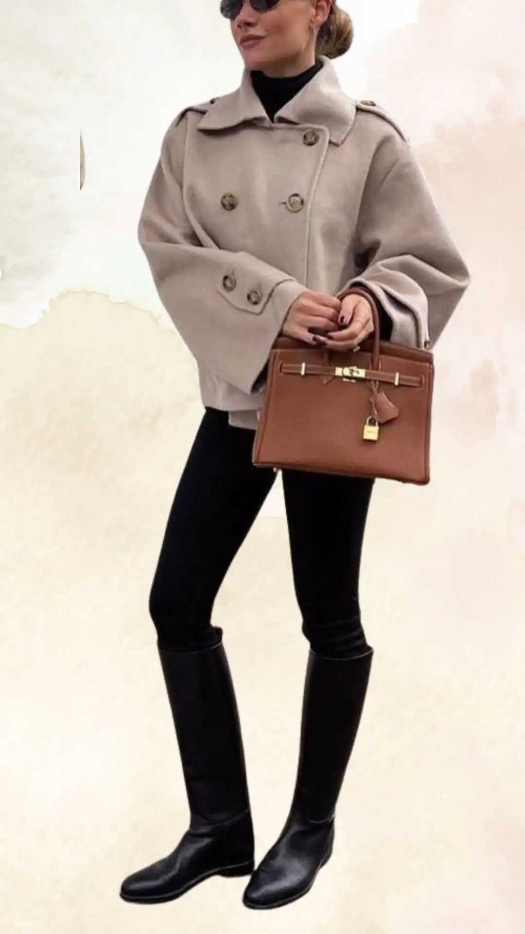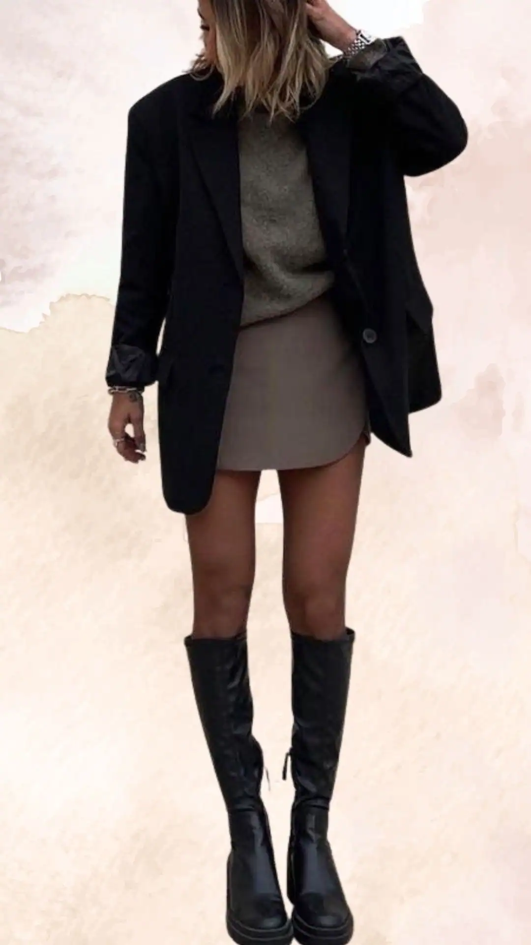 Complete with sleek black knee-high boots, this look is not only trendy but also versatile enough for various autumn outings—from lunch dates to school runs.