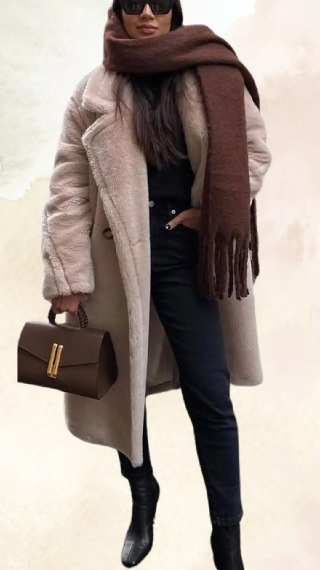This outfit perfectly captures the essence of fall with a cozy, oversized beige faux fur coat that’s not only stylish but also provides essential warmth for those brisk days.