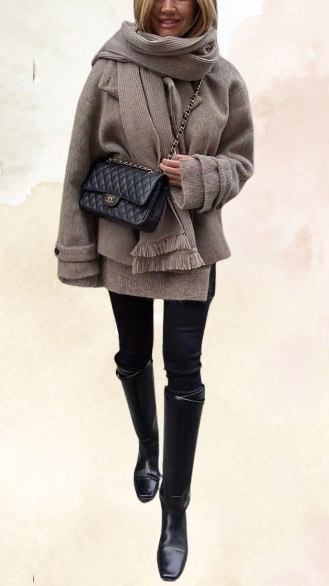 The matching beige knitted scarf adds an inviting texture, enhancing the visual appeal of the ensemble while keeping you snug as temperatures drop.