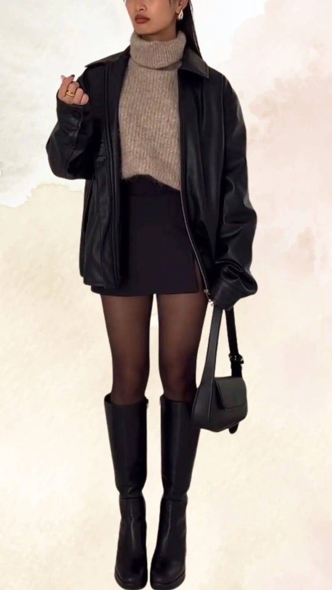 Paired with a black mini skirt, this combination creates a balanced contrast that is both cozy and chic. The oversized black leather jacket introduces an edgy flair, ensuring you stay fashionable while copping the laid-back vibe.