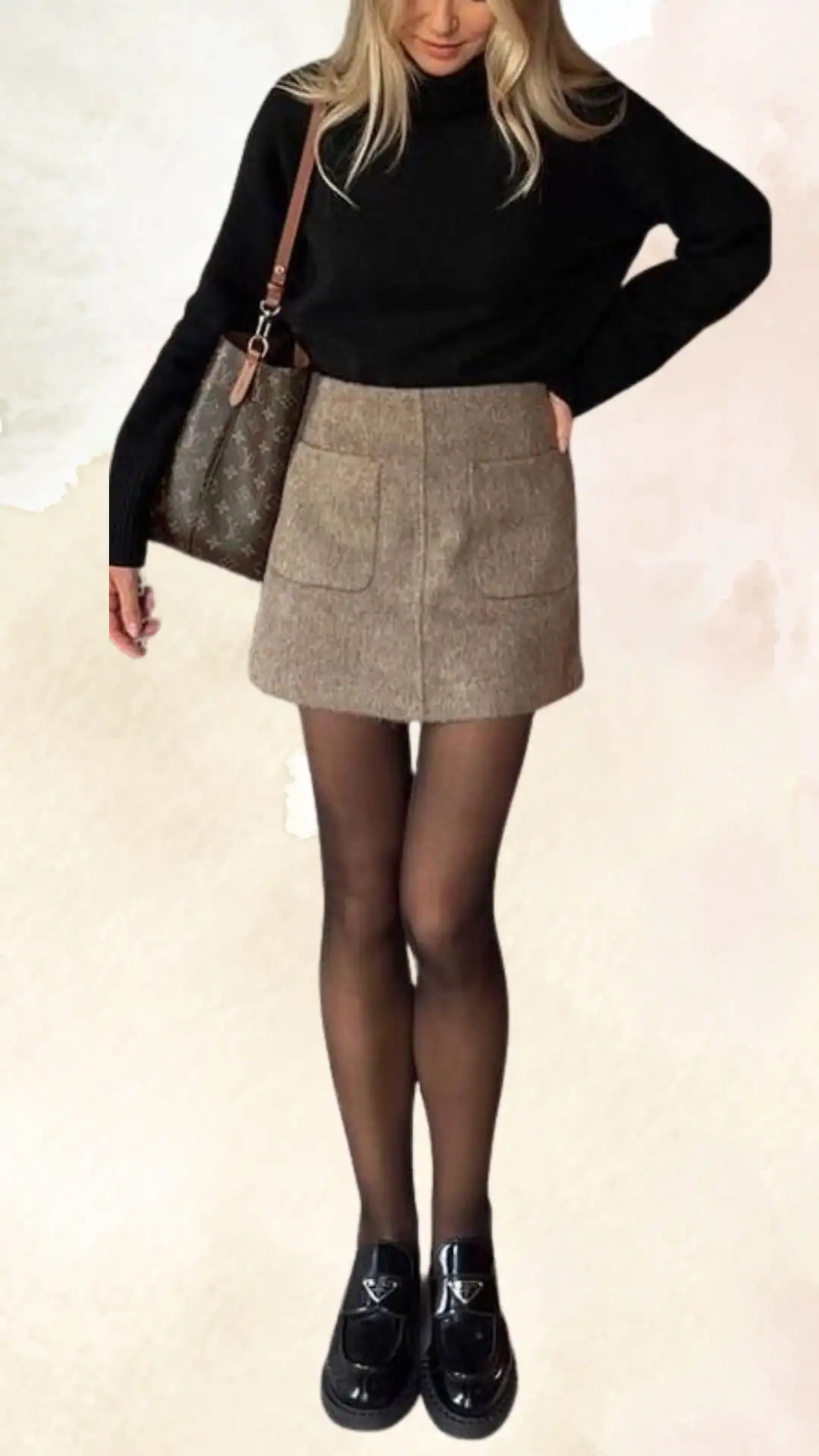 Paired with a fitted light brown mini skirt, the ensemble radiates warmth and style, making it ideal for autumn outings.