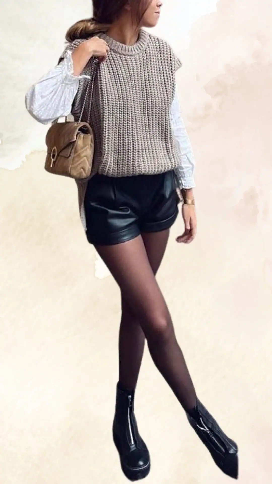 The high-waisted black faux leather shorts add a touch of edge, while sheer black tights complement the sleek look.
