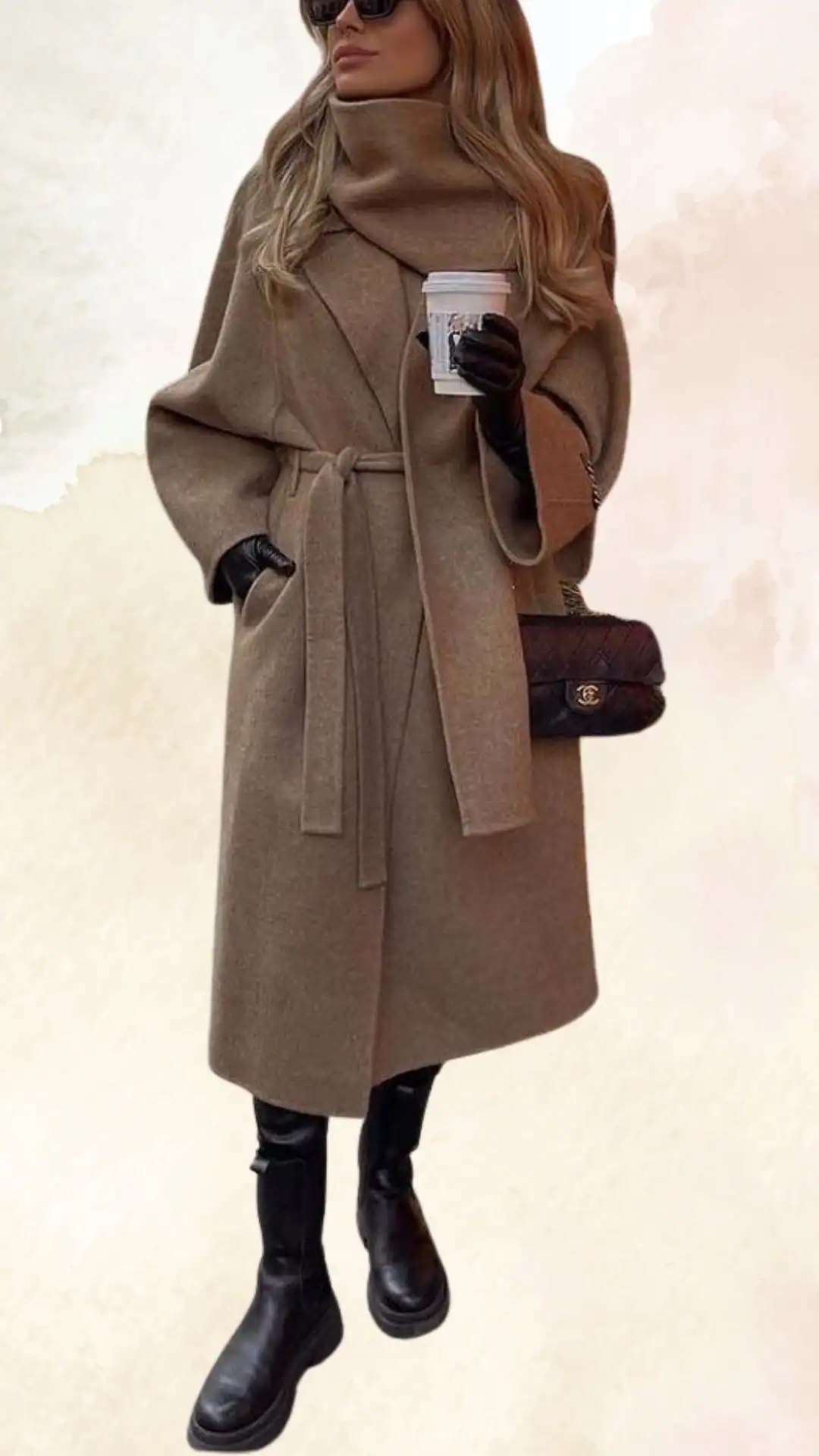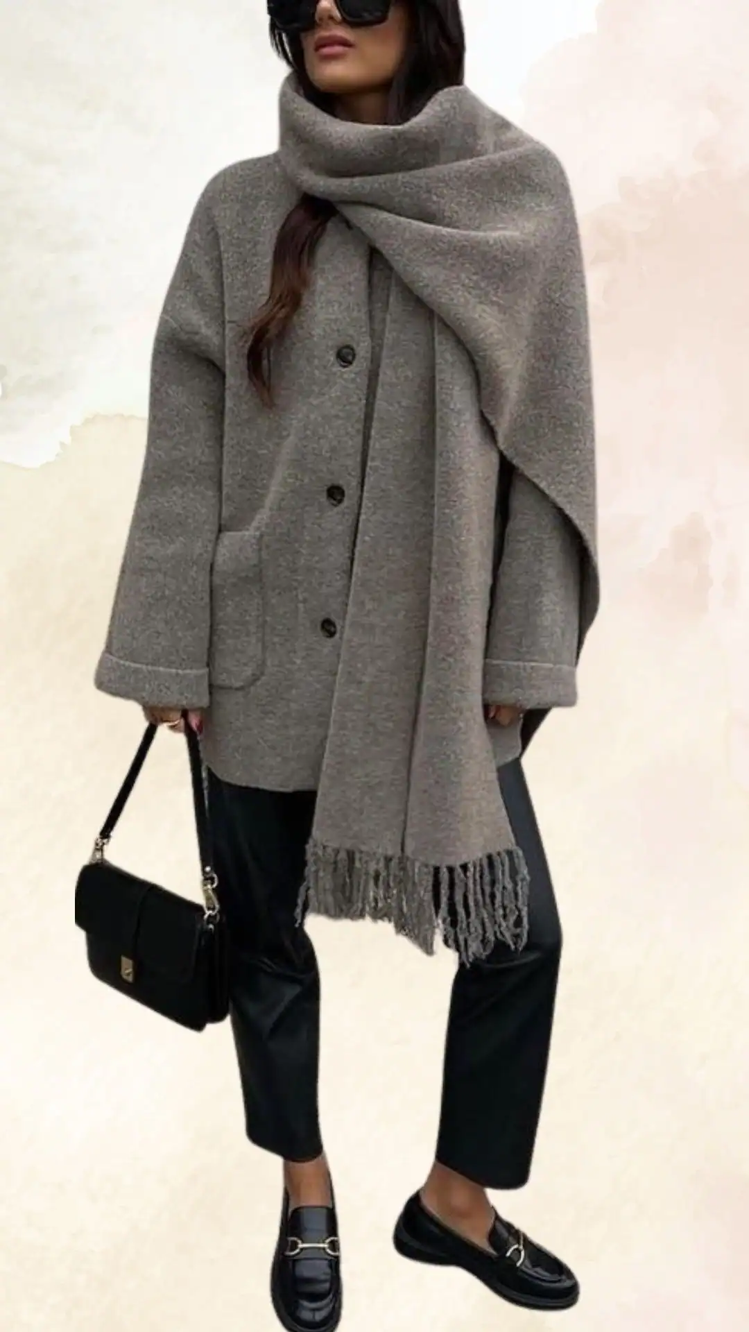 The coat’s sophisticated collar and large buttons add a refined touch, while the matching oversized scarf offers an extra layer of warmth and chicness for brisk autumn days.