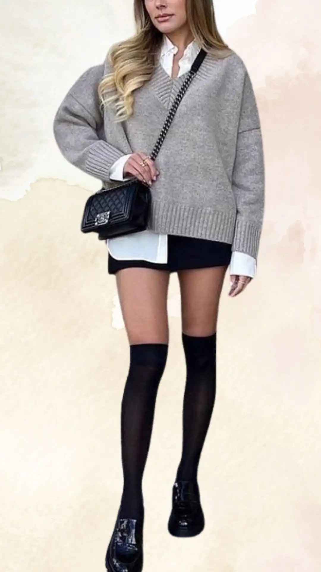 The relaxed fit of the sweater beautifully contrasts with the fitted black mini skirt, creating a balanced silhouette that flatters the figure.