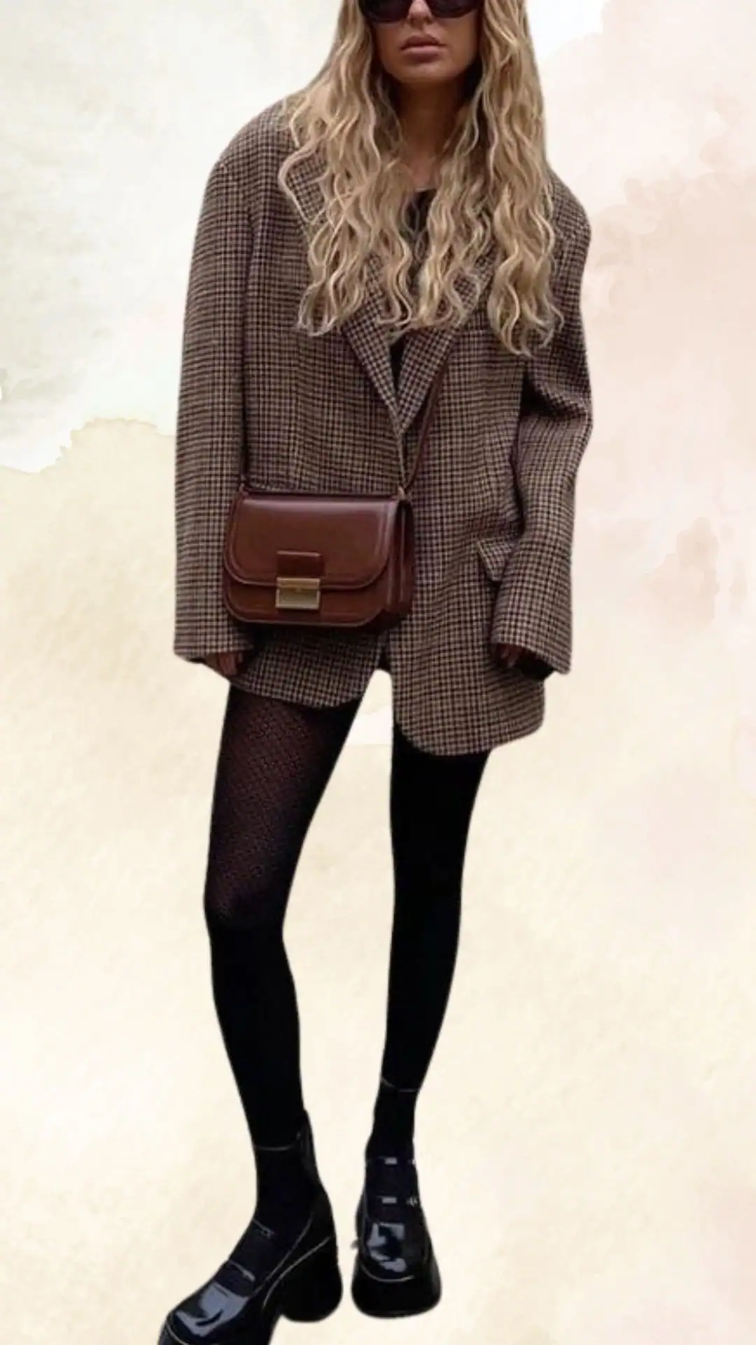 This outfit epitomizes effortless fall fashion with its oversized brown and cream houndstooth blazer, perfect for layering. The relaxed fit not only adds comfort but also keeps the look stylishly casual.