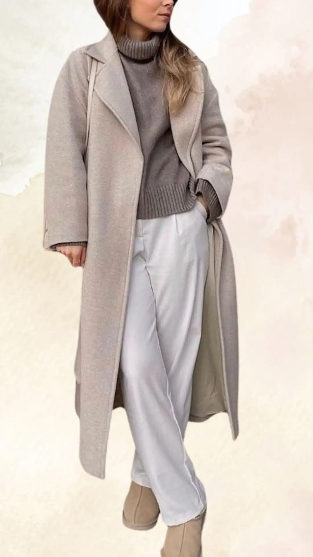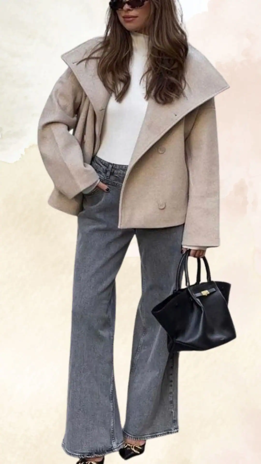 This outfit exemplifies the perfect blend of comfort and elegance for fall. The light taupe oversized wool coat features a stylish wide lapel, making it a standout layering piece.