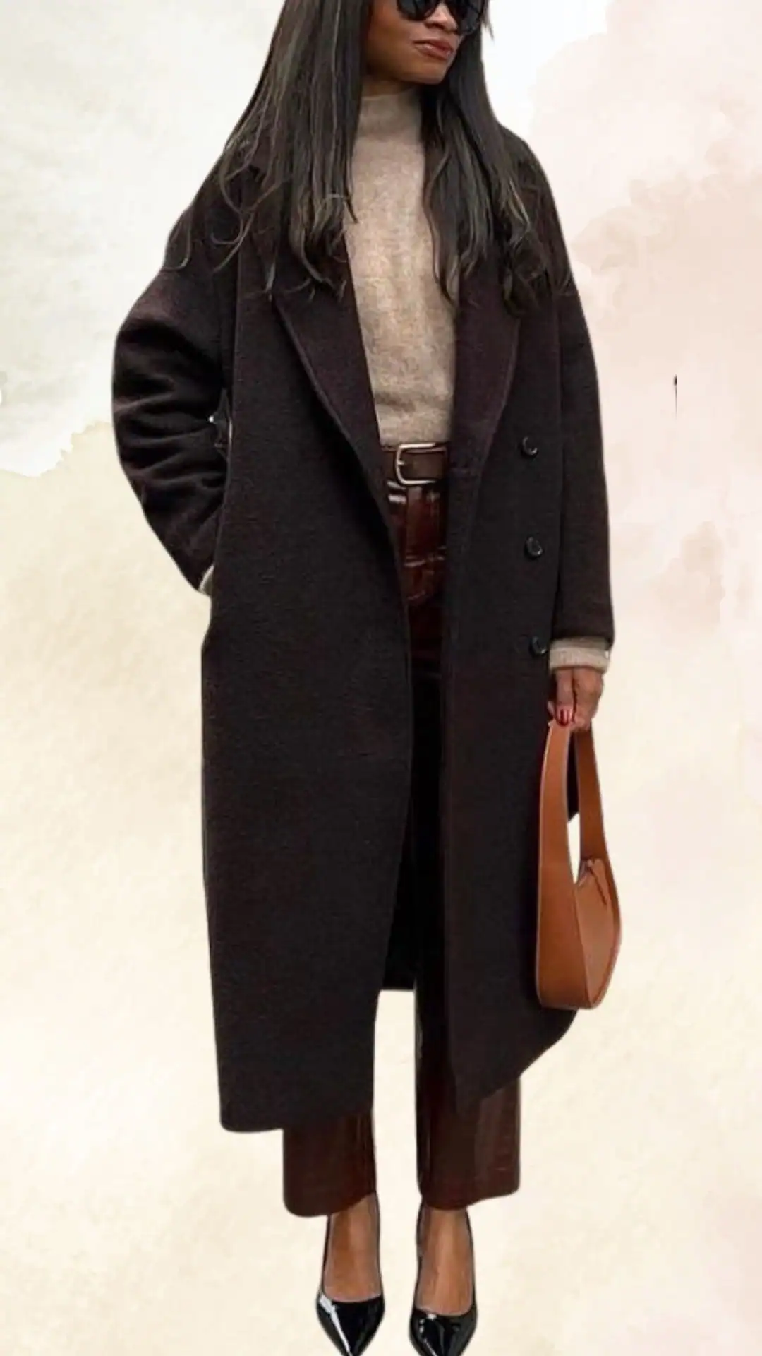 This chic fall ensemble features a statement-making long, dark brown, oversized coat that serves as a versatile layer for the cooler months. Designed with a notch lapel and classic button closures, it effortlessly combines elegance with comfort.
