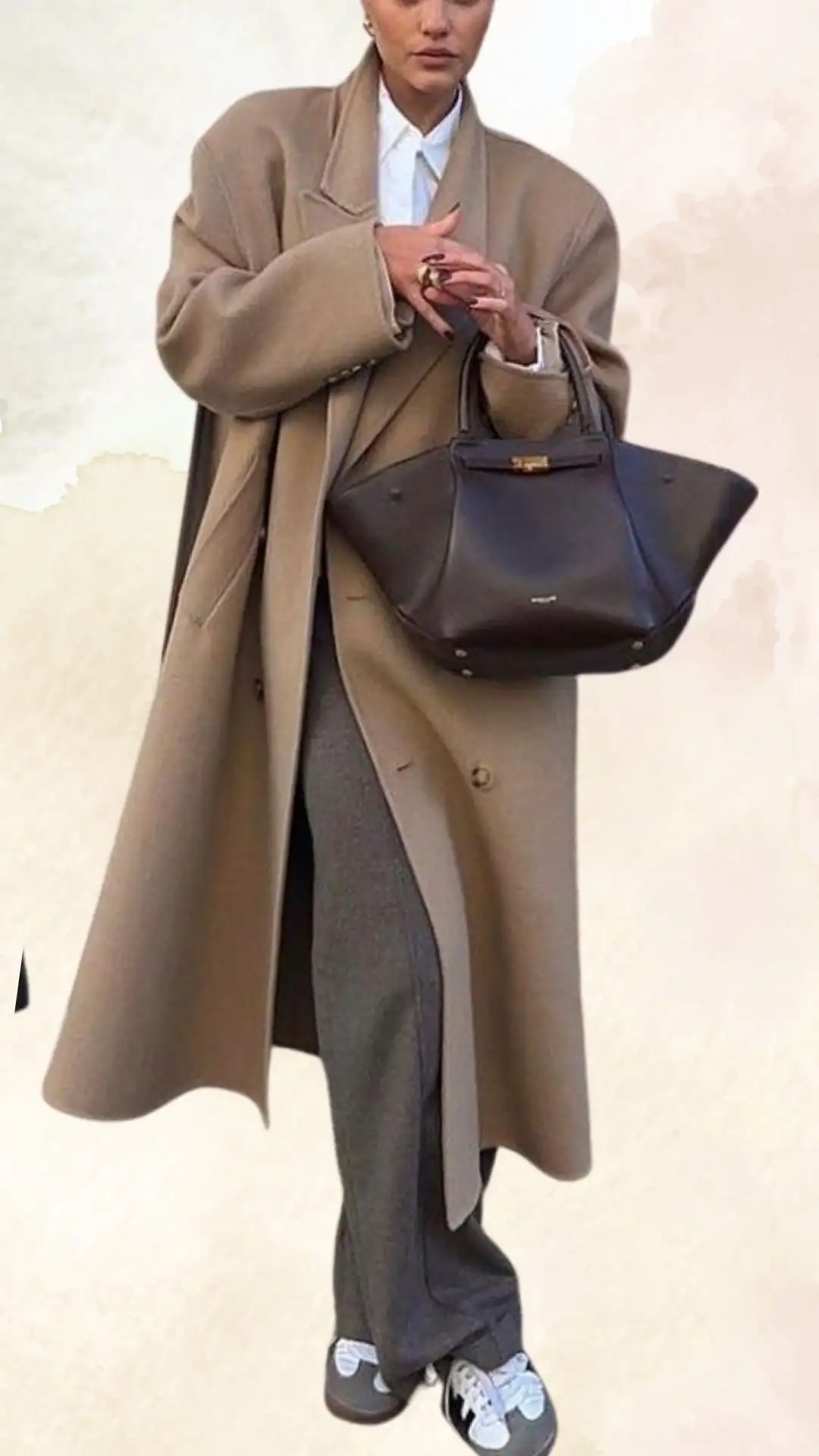 This chic ensemble features a light beige oversized double-breasted coat, designed with wide lapels that exude sophistication and warmth.